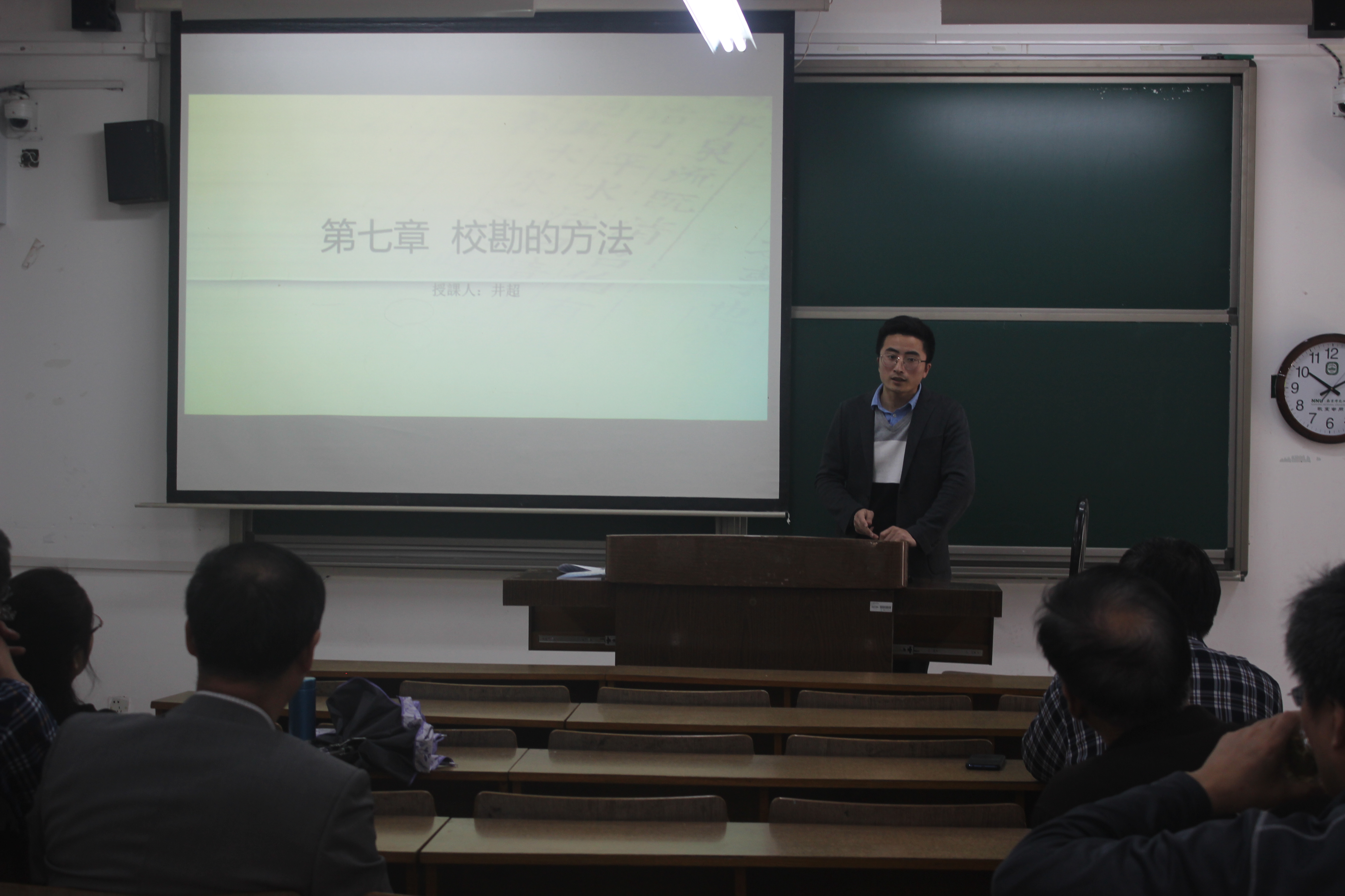 本次活动主要由新教师试讲和专家点评两部分组成。首先,井超老师汇报了自入职以来在导师的指导下参与教学的情况。在听课、当助教、帮助导师进行网络课程建设的过程中,井超老师对其教学工作更加了解。接着,井超老师正式开始讲课。在回顾了上节课的内容后,井超老师引出了本课内容“校勘学的方法”,对对校法、本校法、他校法和理校法四种方法做了简单介绍,并结合清代阮元的《十三经注疏校勘记》着重介绍了对校法。