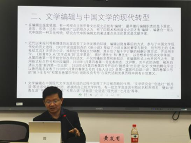 黄教授提出,对“中国现当代文学编辑的文学史意义”的研究尚且不够,且仍有难度,一个好的研究应该有生长性。黄教授从六个部分展开论述。首先,文学编辑是一个长期被冷落的研究领域。在文学生产流程中,与文学创作相比,文学编辑常常被定位为一种辅助性工作,其劳动成果很难进行独立的分割,这给研究者带来困难,史料的缺乏也制约了文学编辑研究的发展与深入。第二,黄教授具体阐释文学编辑与中国文学的现代转型之关联,认为文学编辑在中国现代文学流派形成的过程中发挥了不应被忽略的作用。第三,黄教授讲述了中国当代文学编辑制度的建立与发展。第四,黄教授认为,文学编辑是发现的艺术,发现和培养文学新人在中国现当代文学编辑史上形成了一种优良传统。第五,文学编辑是文学经典化的重要环节,在文学传承体系中,作家全集的编辑出版具有特殊的意义。最后,黄教授指出,文学编辑是文学活动的“第五要素”。此外,编创双栖等文学史现象、编辑史料的发掘与整理也值得我们深入研究。