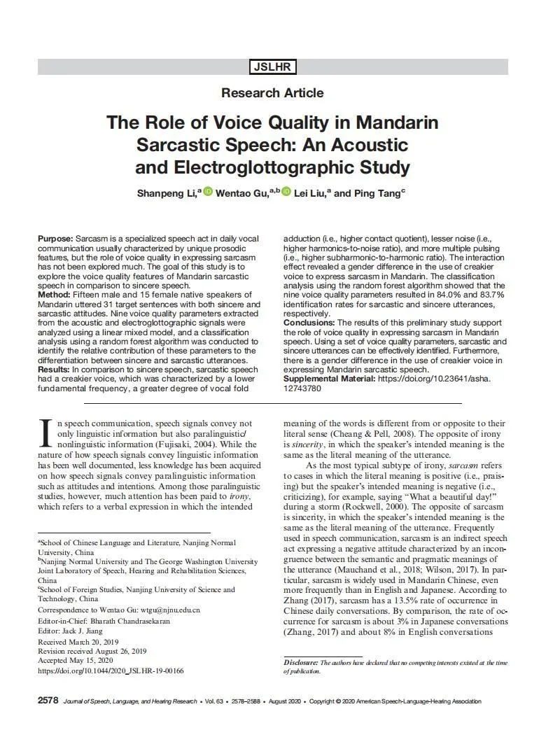 顾文涛教授主持的语音学研究团队于今年8月在SSCI语言学一区期刊Journal of Speech, Language and Hearing Research上发表了论文Therole of voice quality in Mandarin sarcastic speech: An acoustic and electroglottographic study(嗓音音质在汉语反讽话语中的作用:基于声音与电子声门仪信号的研究)。论文第一作者为网赌
