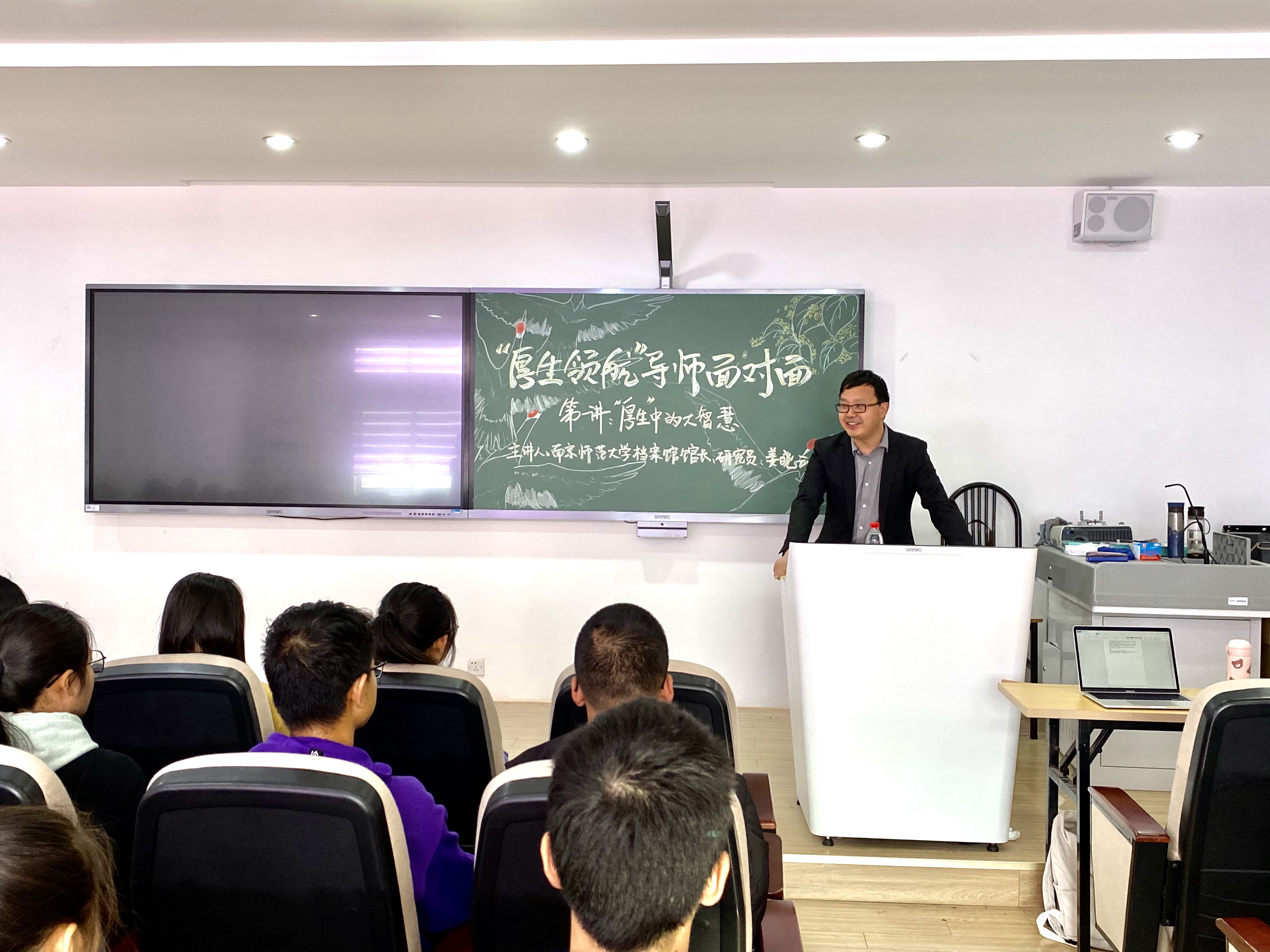 首先,姜老师从自己的人生经历谈起,介绍了自己早年的求学经历。然后,他从中国古代哲学维度出发,结合南京师范大学校史,从多个角度阐述了“厚生”的概念,使同学们能够深刻理解在学习生活中贯彻实践“厚生”精神带来的巨大帮助。姜先生告诉同学们他希望能够通过分享自己的人生感悟,让同学们收获厚生中的大智慧。