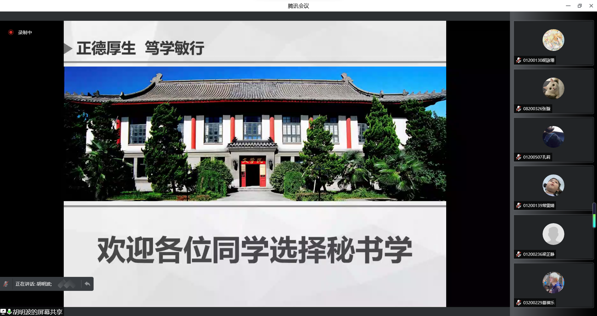 指导会第三部分,胡明波老师从专业简介、培育目标和课程设置三个方面对秘书学专业进行了系统的介绍。此外,胡老师还和大家分享了六名秘书学专业2021届优秀毕业生的祝福视频。