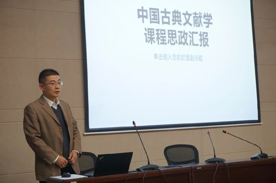 王永吉老师就《中国古典文献学》课程思政建设情况作了汇报。他指出,古典文献是中华优秀传统文化的载体,整理、研究古典文献是弘扬优秀传统文化的基础。研究传统文化载体的发展演变,能够增强同学们对中华优秀传统文化的认同感、亲切感,潜移默化中达到了课程思政建设的目标。在实际教学活动中,王老师注重课堂教学与课外实践相结合,曾多次带领同学们参观古籍刊刻场所,共同感受传统文化的传承过程。王永吉老师总结经验,指出课程思政建设的核心是上好专业课,要在培养学生专业能力的过程中完善课程思政建设。