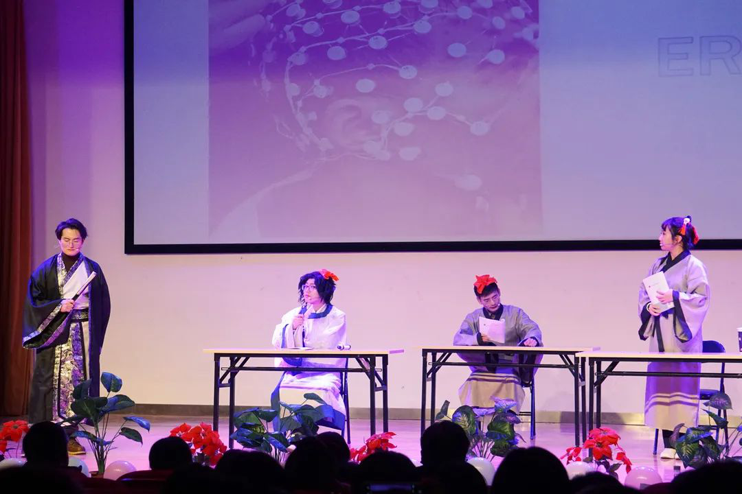 你经历过趣味横生的课堂吗,学习文献用脑电波还是暗送秋波呢?语言学专业的王杰、朱小顺、李朝辉、武笑如同学为大家带来小品《学堂》,幽默的话语引得众人笑声不断。
