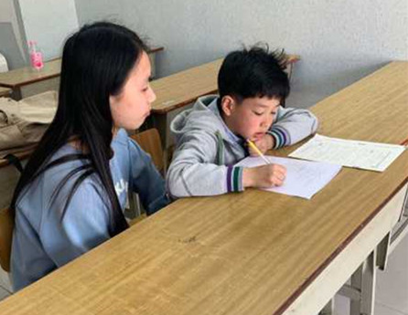 首先,大家集体到达志愿基地,在与基地老师交流沟通工作后,依照老师的分配,去到了不同的小朋友身边,负责督促作业完成的效率和质量。熊婧雯专门负责一个三年级的小男孩,男孩的思维敏捷,但在没有监督的情况下,难以集中注意力于学习,因此就需要时刻检查他的作业完成效率。周怡文负责监督四个小学不同年级的学生,工作任务艰巨,因此毫不懈怠,一丝不苟地逐个检查他们完成作业的情况,及时纠错。邓伊敏负责督促较高年级的几个小朋友,并对个别孩子的英语进行辅导。吴姗珊专门辅导一个自制力较差,经常离开座位捣乱的学生,督促他高效及时地完成作业。大家都以积极饱满的精神投身到志愿活动中去。志愿者们与小朋友们在融洽的相处过程中顺利地完成了当天的学习任务。熊婧雯还在志愿结束时收到了小朋友特意制作的贺卡,里面包含着对志愿者老师的喜爱与感谢,这也极大鼓舞了志愿者们。