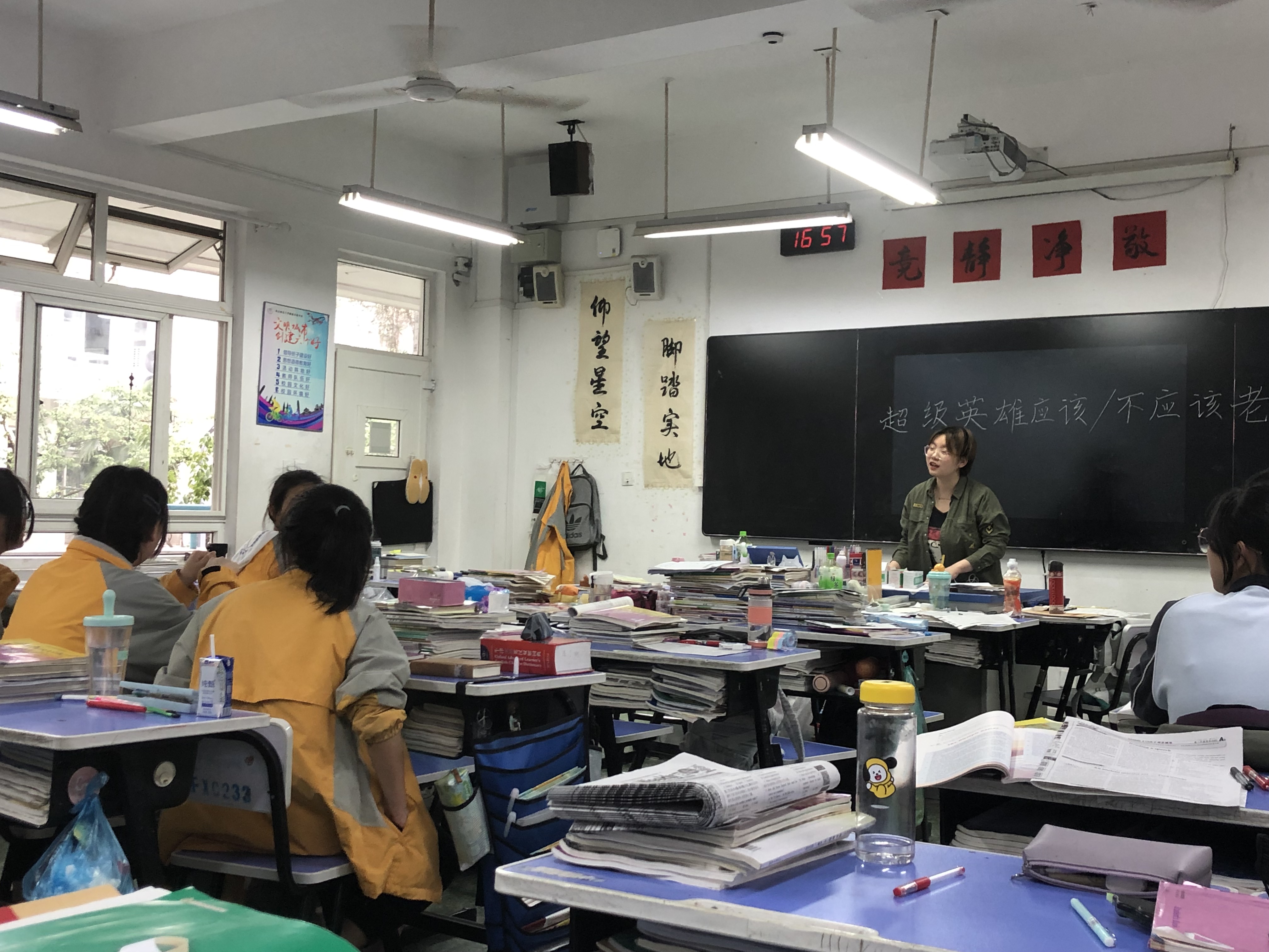 首先,主讲人孙晨先对在高一(4)班的同学们进行点名,干事们在黑板上写下本次特色活动——即一场辩论赛的主题“超级英雄应该/不应该老去”,大家都做好了充分的课前准备。然后,主讲人请同学们根据自己的意愿进入正方和反方,并依次陈述自己的观点。活动正式开始,同学们起初都非常腼腆,没有人主动发言,但是在主讲人的一再激励下,张杰同学率先进行发言。他站在反方“超级英雄不应该老去”的角度阐述了在时代的发展中,超级英雄是一种理想信念的存在,所以不应当老去。紧跟着他的发言,同一队的曾垂方同学也发表了自己的看法。正方选手这时也不甘示弱,蔡诗琪同学列举了漫威电影中超级英雄的演变来反驳反方的观点,同队的曹秋冉同学也对队友的发言进行了充分的补充。最后,由主讲人孙晨对同学们的精彩辩论开展点评和指导工作,她先是以之前的课堂教学为案例,告诉同学们首先破除心证,就是不管你自己内心的想法是什么,都应当站在所处正反方的角度来考虑辩题,其次要对辩论的主题进行读解,即了解清楚“超级英雄”的定义是指什么,是大众所熟知的漫威电影中的人物亦或是其它,再次理解清楚“老去”是指心灵还是身体上的老去。与此同时,她也对同学们在辩论赛场上的表现给予了高度的肯定与赞扬。