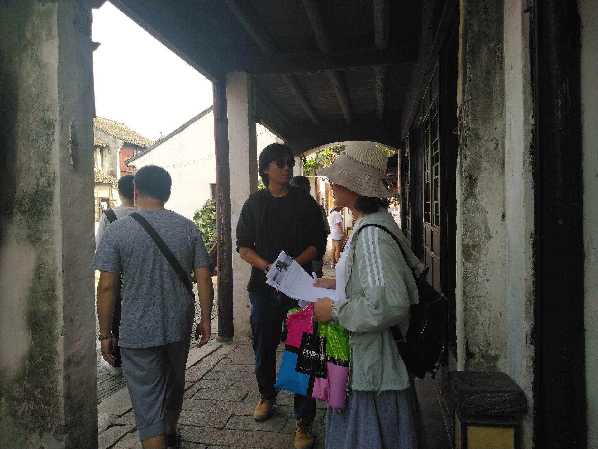 在到达周庄后,队员们首先在庄子上简单观察了一下,熟悉了周庄的地形后,队员们在几个主要的游客集中地开始发放问卷。虽然有些游客不是很乐于填写问卷,但在队员们的不懈努力和热情解说下,最终共成功收集到了16份问卷,且皆为有效问卷,男女老少都有涉及。