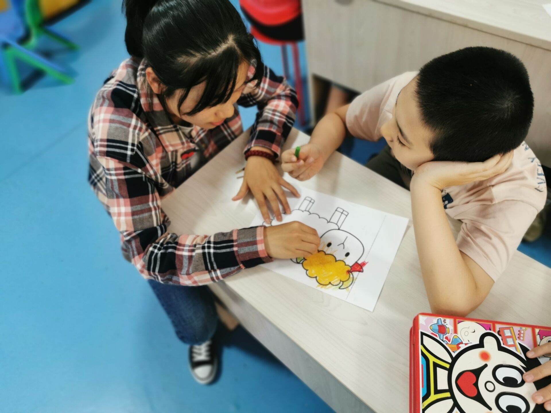在画画组里,老师率先完成一张涂色,将它贴在黑板上,给孩子们做示范。随后跃跃欲试的孩子们拿到了各自要用的图片和蜡笔,开始了创作,而志愿者在老师的安排下帮助两位年龄较小的孩子。刚开始,黄雨轩和小朋友共同快速地完成了第一幅画,孩子丰富的想象力为图画增添了独特的美感,可当画到第二幅时,孩子渐渐失去了耐心,将蜡笔扔到一边。不过,在志愿者的细心安抚下,他顺利地画完了整幅画。朱宇杰也辅助其他的孩子们安静独立地进行创作,总体的氛围十分和谐的。