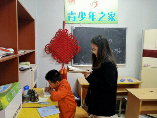 志愿者们在下午四点三十分抵达百水芊城志愿基地,常规活动开始,四位志愿者分别进入各自负责的教室,走到社区儿童身边对他们的学习任务予以监督与帮助。