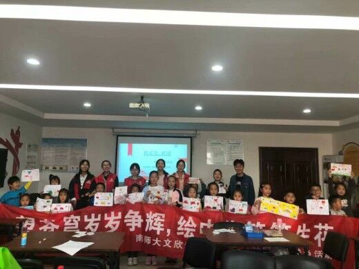 活动在小朋友的掌声中拉开了序幕。志愿者先用PPT给小朋友介绍这次活动的主题,接着给小朋友分发了彩笔和画纸,告诉他们怎样制作手抄报,并且叮嘱小朋友在使用剪刀的时候注意安全。小朋友们在认真听完志愿者的介绍后都迫不及待的开始了他们的创作。刚开始的时候,一些小朋友还不太适应,志愿者们便耐心地给他们讲解如何制作手抄报,小朋友都专心听讲。经过不断的尝试,每一位小朋友都拿起手中的画笔,在画纸上书写他们对祖国的理解与爱。
