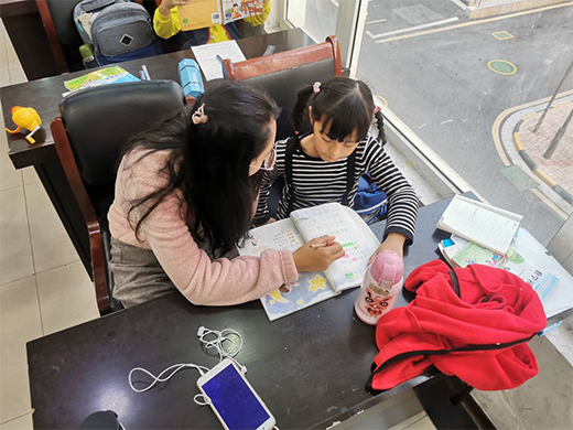 当志愿者到达志愿基地时,“四点半课堂”的孩子们已经在值班老师的安排下,坐在各自的位置上,认真地写着自己的家庭作业。在与基地老师简单的寒暄之后,干事和两位志愿者很快就投入到志愿工作之中。