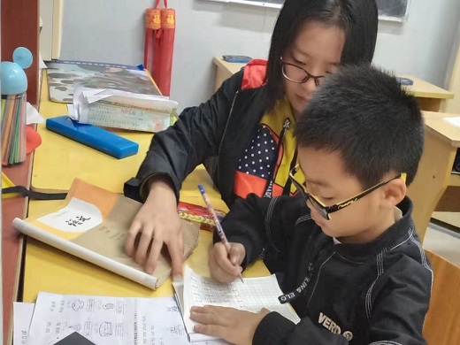 活动开始,基地负责人金老师为志愿者们安排了任务。其中,夏诗雨和包雨希前往大教室看管纪律,徐浈和陆红露分别单独辅导一位小朋友作业。大教室内小朋友们都安静地做着自己的作业,偶尔有一两个低年级的小朋友自制力不够强,出现走神或与周围的同学说话的现象,但在志愿者的提醒后也都能继续专注于自己的作业。遇到无法解决的问题时,小朋友便会举手喊志愿者过去,为他们讲解。有一部分小朋友有听写作业,在复习完所有字词后,志愿者们便会给他们抽部分字词进行默写。当小朋友作业完成后,志愿者们会给他们检查作业,纠正错误。