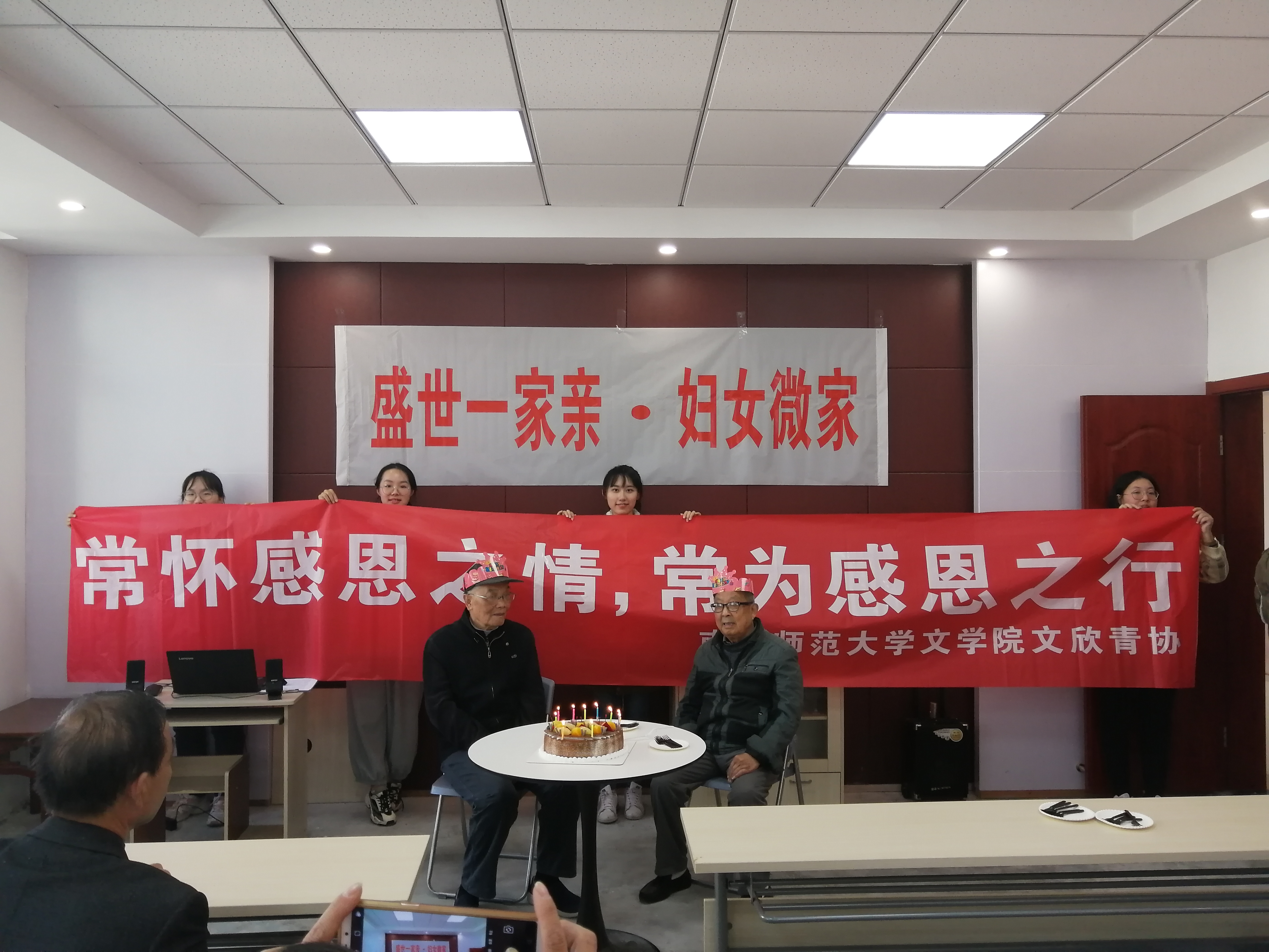 最后,在主持人黄辰妍的致词下,社区的志愿者们扶着年满九十大寿的三位老人入屋,志愿者们与社区老人们共同庆祝着三位老人的生日,伴随着现场的生日快乐歌齐声歌唱。在社区负责人王主任的指挥之下,志愿者们为老人们一同切蛋糕拍下美好的照片。