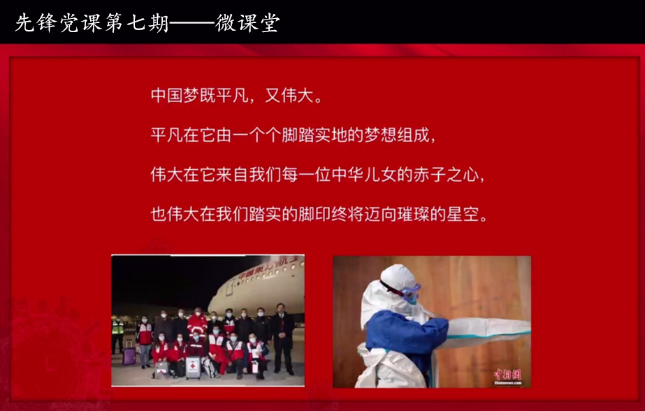 次党课以“大学生如何践行新时代的家国情怀”为主题,首先由党课主讲人周文婧带来以“致敬英雄——最美逆行者”为题的微党课,概述了疫情防控期间作出贡献的许多青年大学生党员的事迹,以“中国梦”的含义入题,讲述了“中国梦既平凡又伟大”的现实意义,讲述了中国梦“平凡在它由一个个脚踏实地的梦想组成,伟大在它来自我们每一位中华儿女的赤子之心,也伟大在我们脚踏实地的脚印终将迈向璀璨的星空”,引导入党积极分子正确认识中国梦与自身的联系,在实现中国梦的征途中实现自己的人生意义和价值。