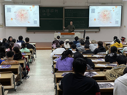 社团于学正楼201,面向大一新生进行招新活动。此次活动共10个社团参加,分为社团宣讲和面对面招新咨询两部分。
