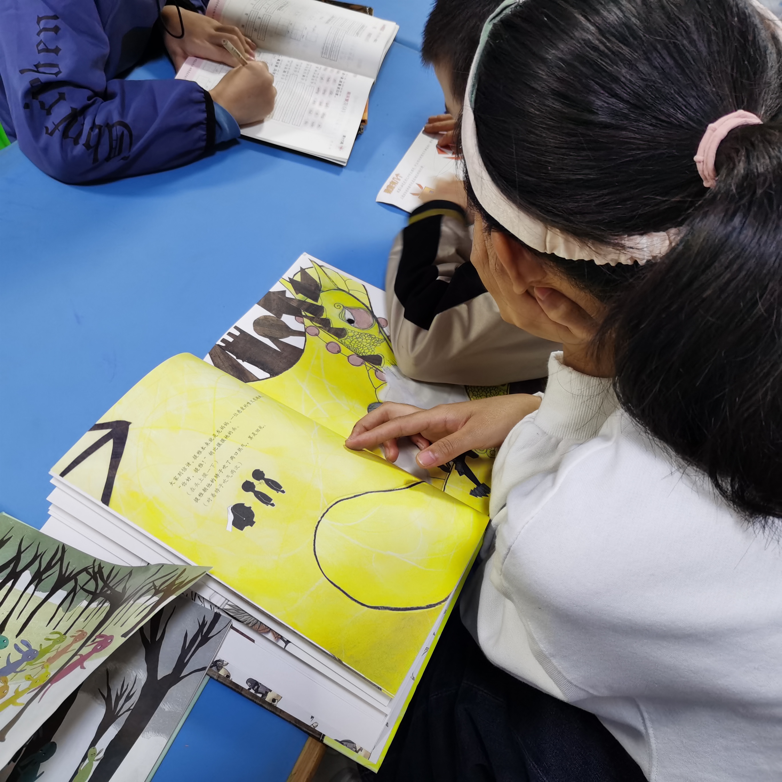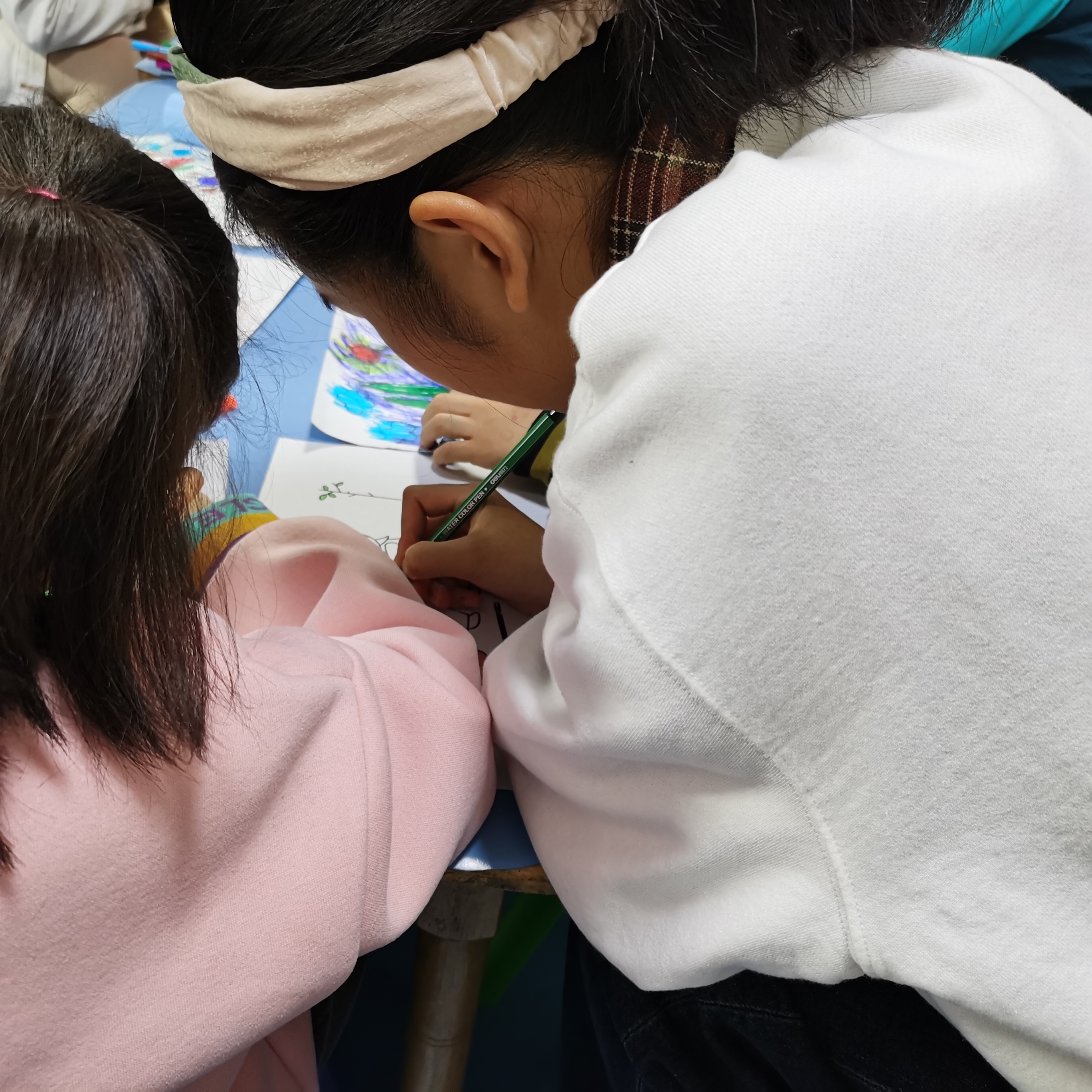 在画画组里,老师给孩子们分发了画纸和水彩笔。志愿者们各拿了一把小椅子,围坐在孩子们的身旁。为了防止画纸被小朋友画破,薛书颜耐心地告诉小朋友们要轻轻地涂颜色。聂筠婷则是手把手地教孩子们在画纸上画上白云和花朵。渐渐地,孩子们失去了耐心,开始在画纸上乱画,但是在志愿者们的安抚下,孩子们还是顺利地完成了自己的作品,并且很开心地展示给老师们看。最后小朋友们和志愿者一起安静地坐在椅子上看着自己喜欢的绘本故事。