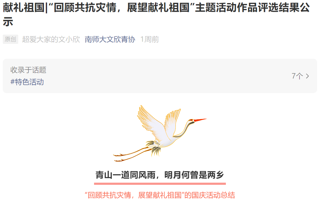 文欣青协为回望祖国人民前半年的团结奋斗历程,推出“回顾共抗灾情,展望献礼祖国”国庆主题活动。