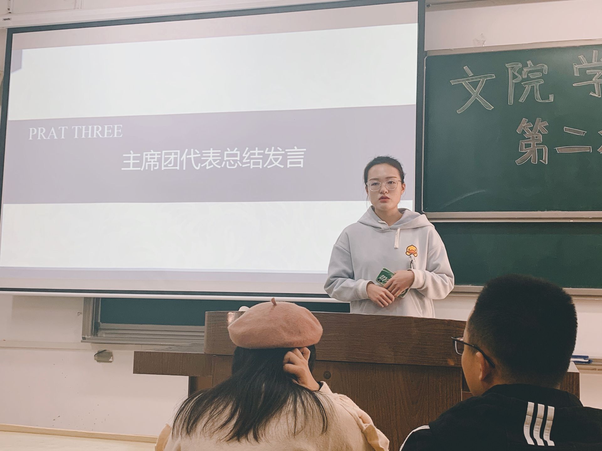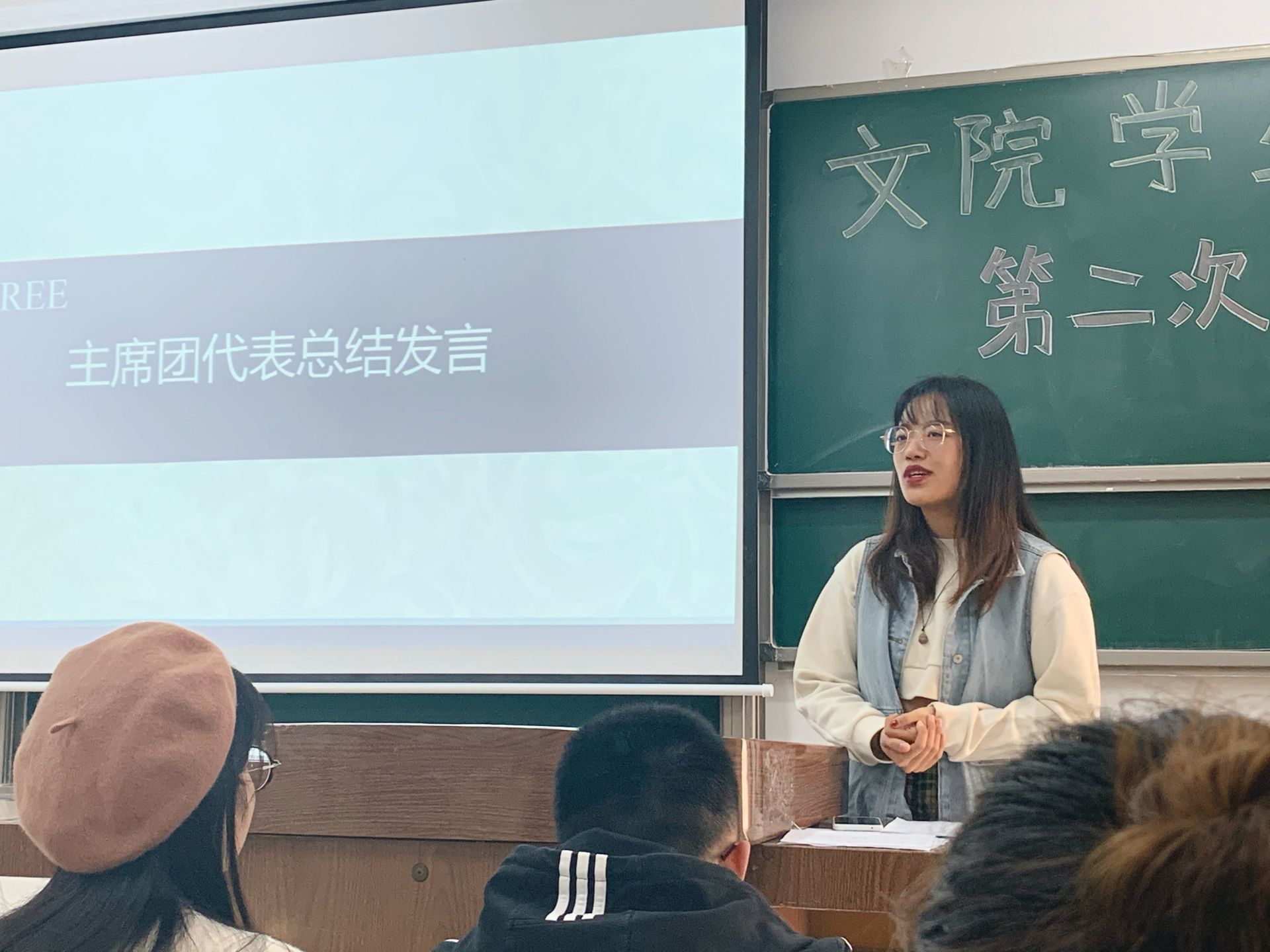 最后,学生会主席朱姿懿上台进行了会议总结,她指出希望干事们做好记录工作,积极投身学生会工作,多做实事少喊口号,同时也提到了学生会后期的组织精简以及干事考评等相关问题。至此本次全体大会圆满结束,也为日后学生会工作高效发展打下坚实基础。(学生会:吴蓓蕾)