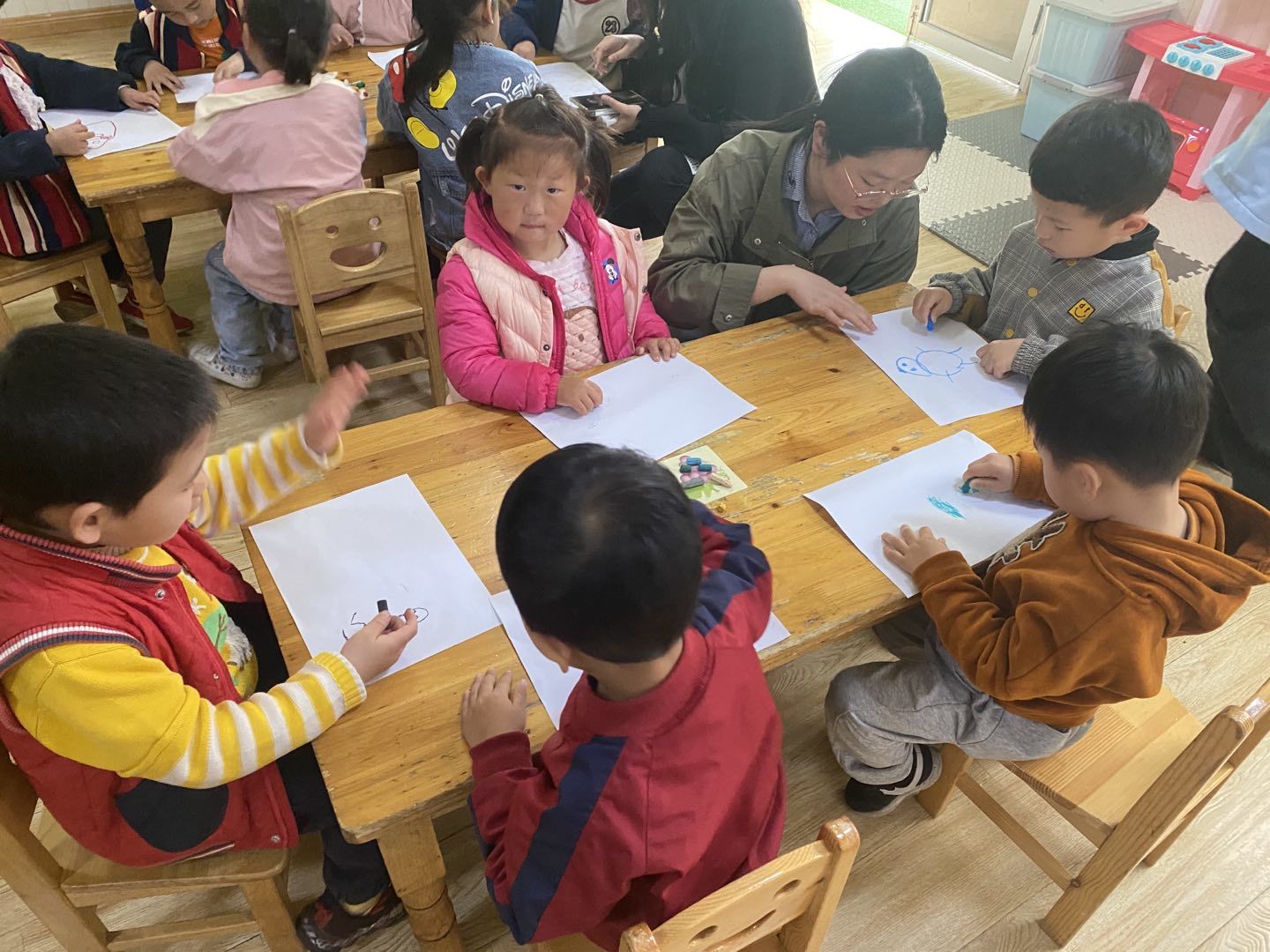 活动开始后,志愿者们先分成三组,分别负责大中小三个班级。在同老师对接后,出于幼儿园课程安排的需要,临时取消了大班的绘画环节,拉长了问答环节的时间。随后,志愿者们来到各自的班级,同孩子们见面,在自我介绍结束后便开始向孩子们介绍交通知识。