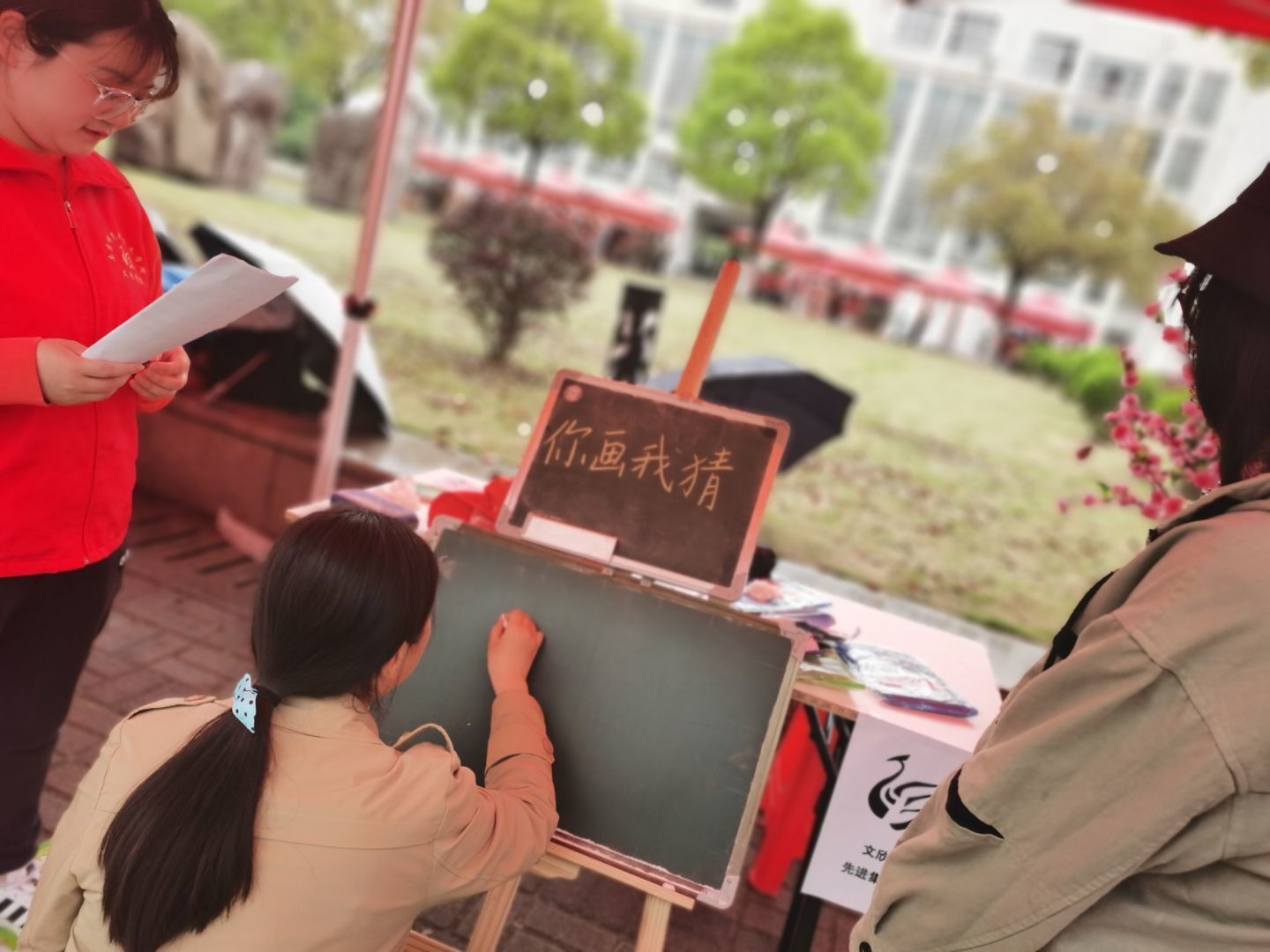 文欣青协在此活动中有两个展位,一是2020-2021年度志愿服务先进集体展示,二是文欣青协“迎百年•灼真知”征文活动展示。在志愿服务先进集体展点,志愿者们准备了“你画我猜”和“飞花令”的活动,许多同学被有趣的活动所吸引,纷纷前来参加。多数同学参与了“你画我猜”的游戏,两位结的伴同学一位在黑板上用绘画的方式描述自己看到的词语,而另一位没有得知词语的同学通过绘画来猜测。无论是否猜对谜底,同学们脸上都洋溢着快乐的笑容,展位上也常常发出欢快的笑闹声,同学之间的距离也逐渐在被拉近。而在“迎百年”征文活动的展位上,文欣青协的志愿者们选择用字谜来展示文字的魅力。灿烂的桃花树上飘扬着诸多字条,就如同征文的文字洋溢在这个意义非凡的春光里。同学们多被此所吸引,思考起了这些谜题的答案,慢慢沉浸在文字的魅力里。有的人稍加思索后兴奋地向工作人员求证,而有的人沉思许久,并和自己和伙伴相互交流,现场的气氛十分活跃。