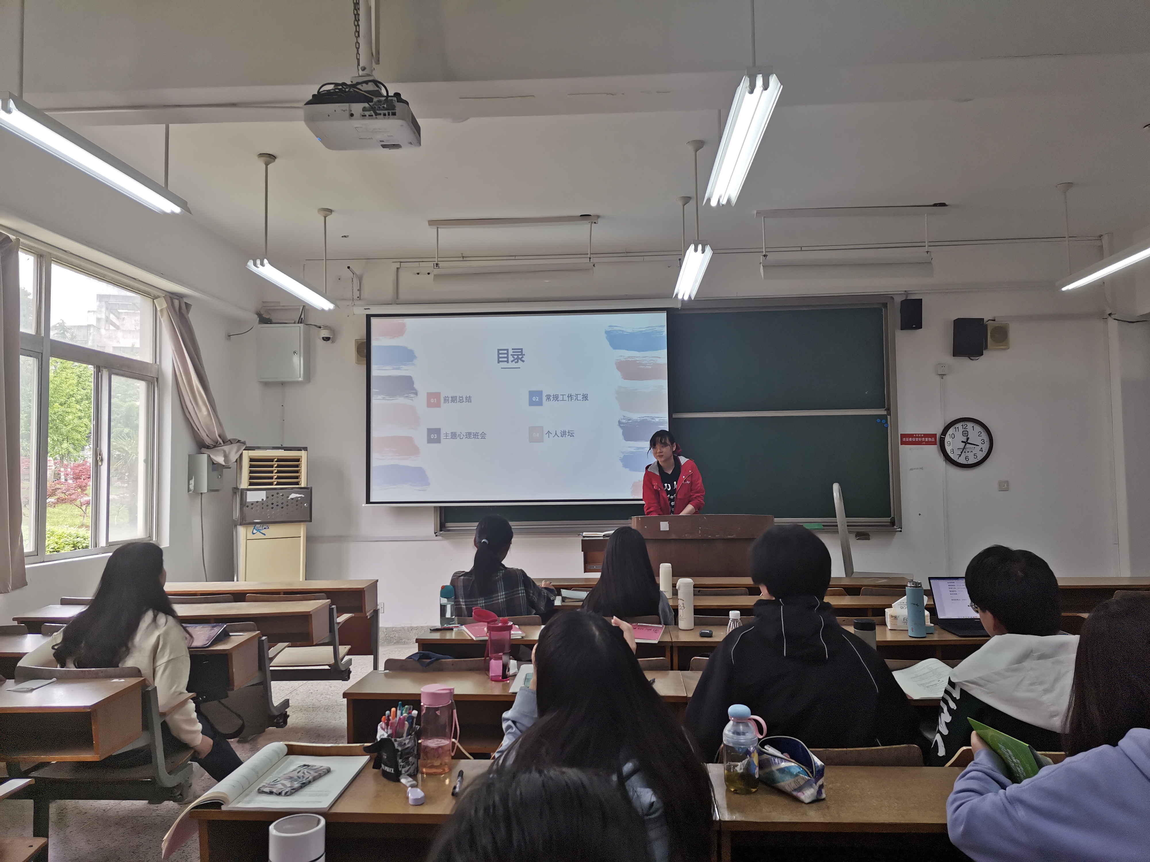 接下来,心理委员张玥为同学们简单地进行了一次心理主题的班会。张玥向大家介绍了几种常见的心理问题,例如社交恐惧症、抑郁症等。她以幽默有趣的小故事情节为同学们介绍这些心理问题的表现形式,同时也给出了有效的疏导方案。