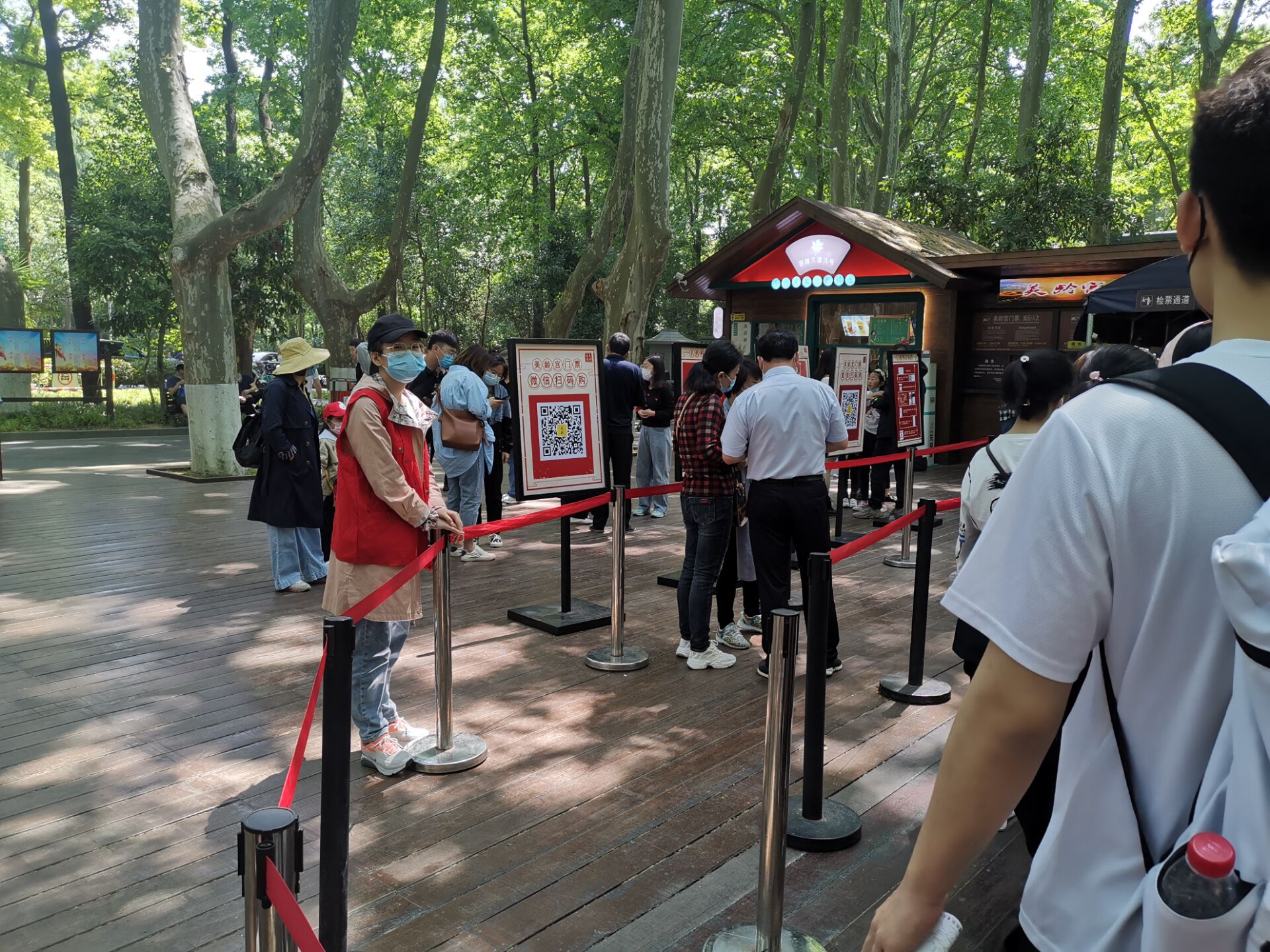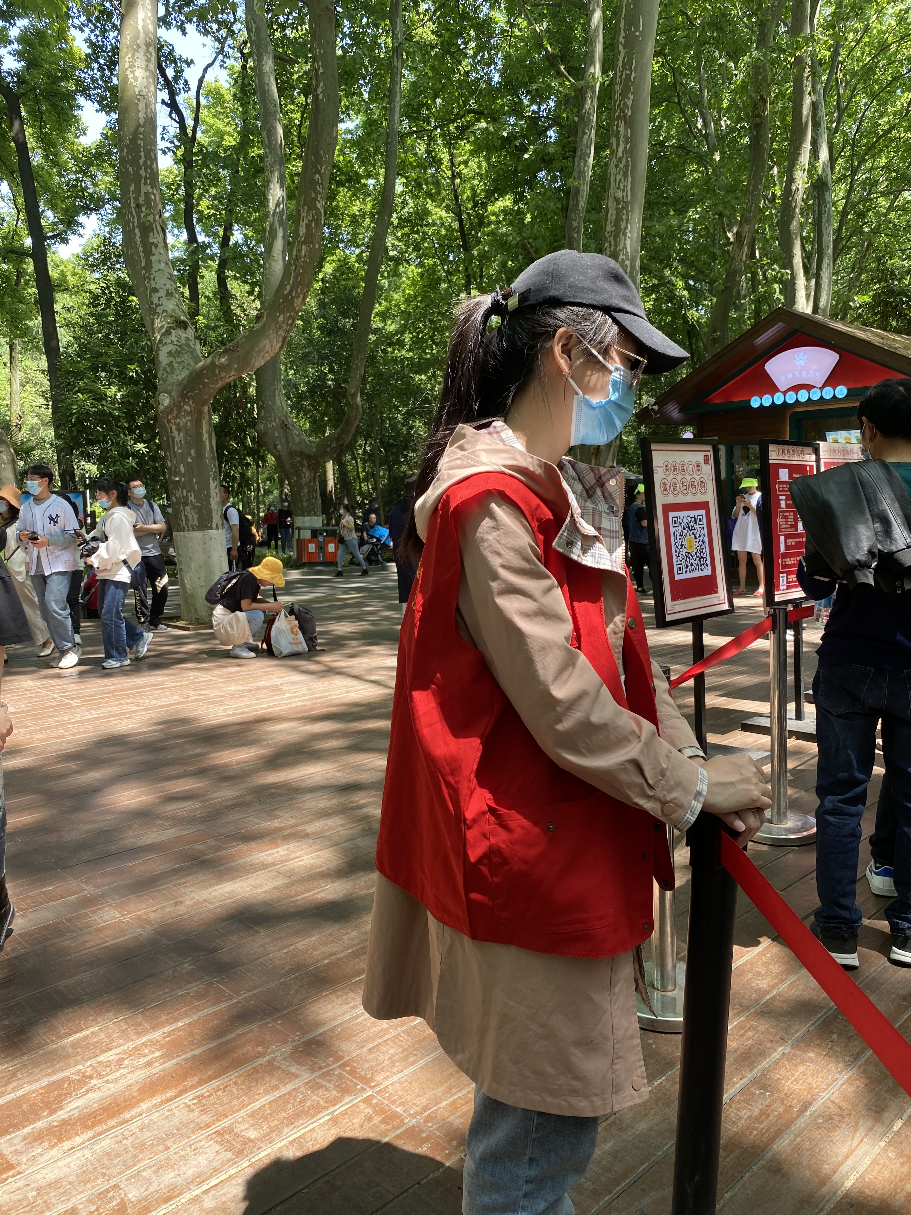 根据志愿者们积累下来的经验,大家在5月4日晚线上进行了馆内15人馆外10人的工作提前分配,很快站到对应的岗位上,精神饱满地开启了这一天的志愿服务活动。在馆外,六名志愿者被安排在客流量较大的检票口,检票口的工作主要是引导游客们有序排队,提醒游客们规范佩戴口罩,提醒并检查游客们出示健康码或行程卡,做好疫情防控工作。此外为了加快队伍的流动,避免堵塞,志愿者们会提醒游客们提前准备好购票码或身份证以便快速通过检票口。与此同时,志愿者们积极为游客答疑解惑,如:去钟山景区或明孝陵以及观光车站口路线、最近的卫生间的位置和线上购票流程等。两名志愿者被安排在前台处指引到达美龄宫的正确路线;两名志愿者被安排在环形路上的小路口,防止游客插队,使进入美龄宫的队伍有序;一名志愿者被安排在美龄宫门口,为游客指引进美龄宫的单行路。在馆内的几名志愿者分别被安排在美龄宫地下室、二楼楼梯口、三楼出入口处,在这些位置志愿者为游客指引道路,客流量较大时进行疏通,避免游客逆行参观,提醒游客戴好口罩、文明参观。美龄宫的工作人员也会按时与志愿者们进行换班,使我们的志愿者有短暂的休息和调整时间。