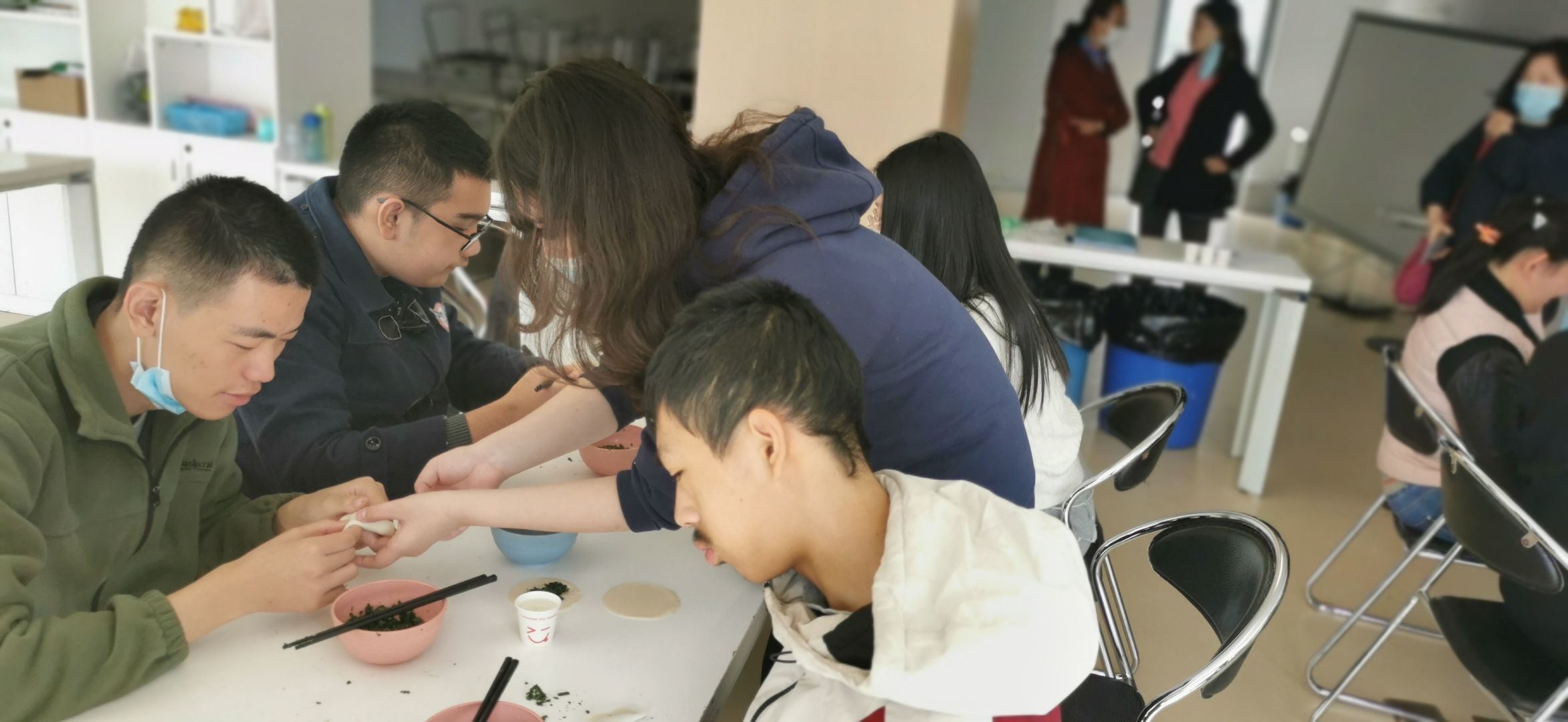 早九点整,志愿者于学则路地铁站集合,前往睿泽基地。来到睿泽基地后,在工作人员的带领下,志愿者有序进入活动场地。在这里,志愿者们见到了前来参加活动的障碍人士学员和陪同他们的家长。经过短暂的交流和休整后,活动于早十点正式开始。首先,志愿者们迅速找到工作岗位,由两名志愿者负责拍照,两名志愿者播放课件及视频,一名志愿者负责包饺子的准备工作,其余志愿者则进行一对一教学,引导学员学习手指操内容。教学活动期间,有学员学习较为缓慢或遇到困难,志愿者都进行了耐心帮助,负责多媒体的志愿者也与学员打成一片,回答学员提出的问题。最终,教学活动在全体志愿者和学员共同展示手指操后结束。