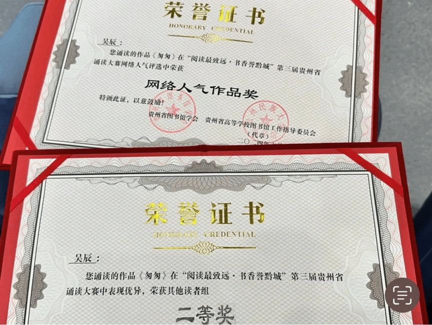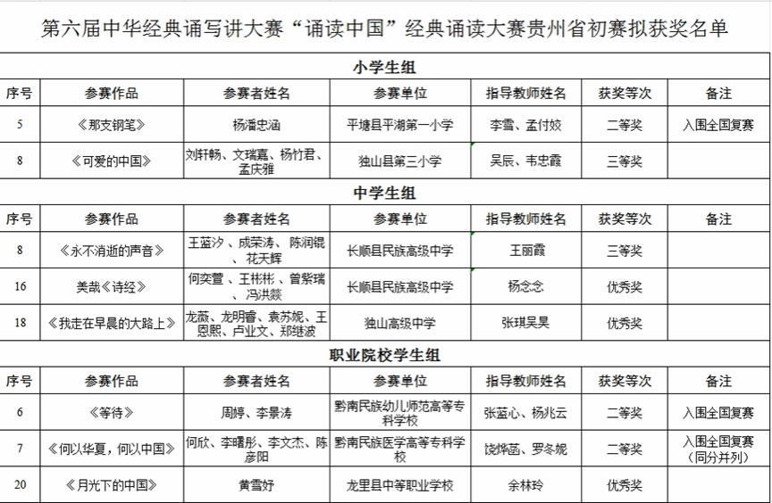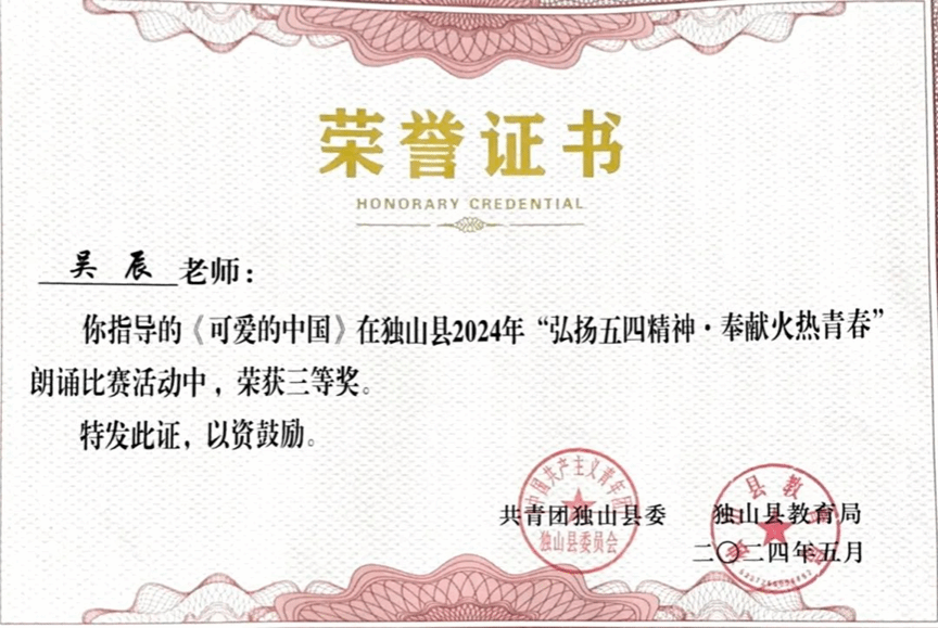 于是,吴辰又指导孩子们重新排演《可爱的中国》,经过一个多月的打磨修改,参加了第六届中华经典诵读诵写讲大赛“阅读中国”经典诵读大赛贵州省初赛,经过层层推选,最终荣获小学生组全省三等奖。此外,吴辰还指导同学参加了第二届独山县弘扬科学家精神演讲大赛并获得三等奖。