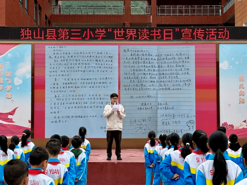 [吴辰在世界读书日为孩子们接收爱心图书并分享哥哥姐姐们的来信]