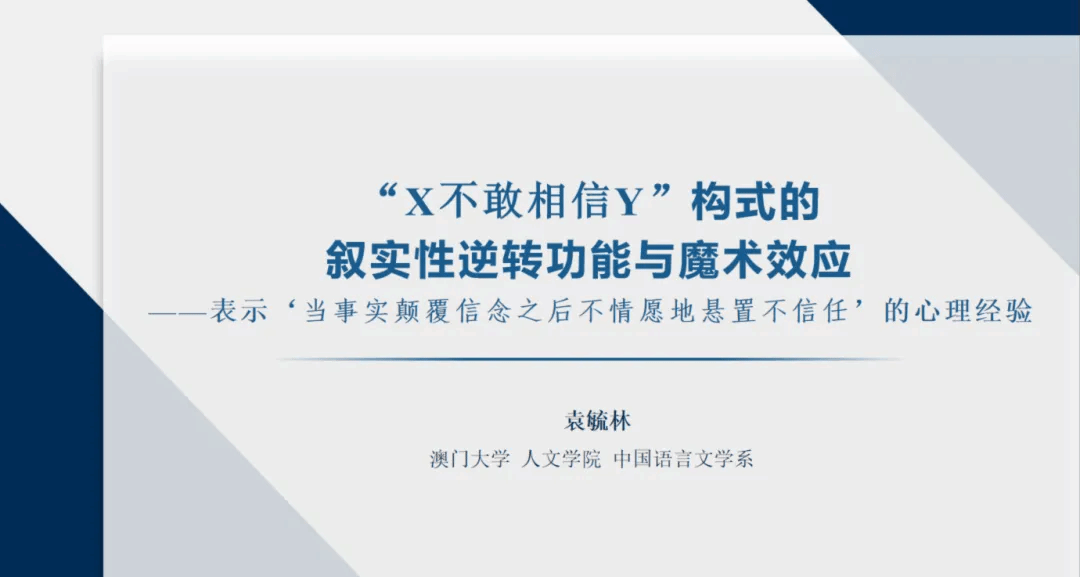 通过详实的语料分析,袁教授进一步探讨了该构式的叙实性逆转过程及其心理机制。“X不敢相信Y”构式通常由“X(话主)+否定意愿表达(不敢/无法/难以)+相信+宾语小句Y”组成,其典型意义在于表达“反预期”的情境,即某一事件的发生超出了话主的预期。这种叙实性转变源于使用者的惊讶心理与意外情境触发的“魔术效应”,即信念被颠覆后,话主在意外中悬置最初的不信任,最终接受Y的真实性。当上下文明确提示宾语小句的真假(如使用“事实”或“谎言”等词语),或当听者认同话主的立场时,构式的叙实或反叙实意义会得到进一步强化。