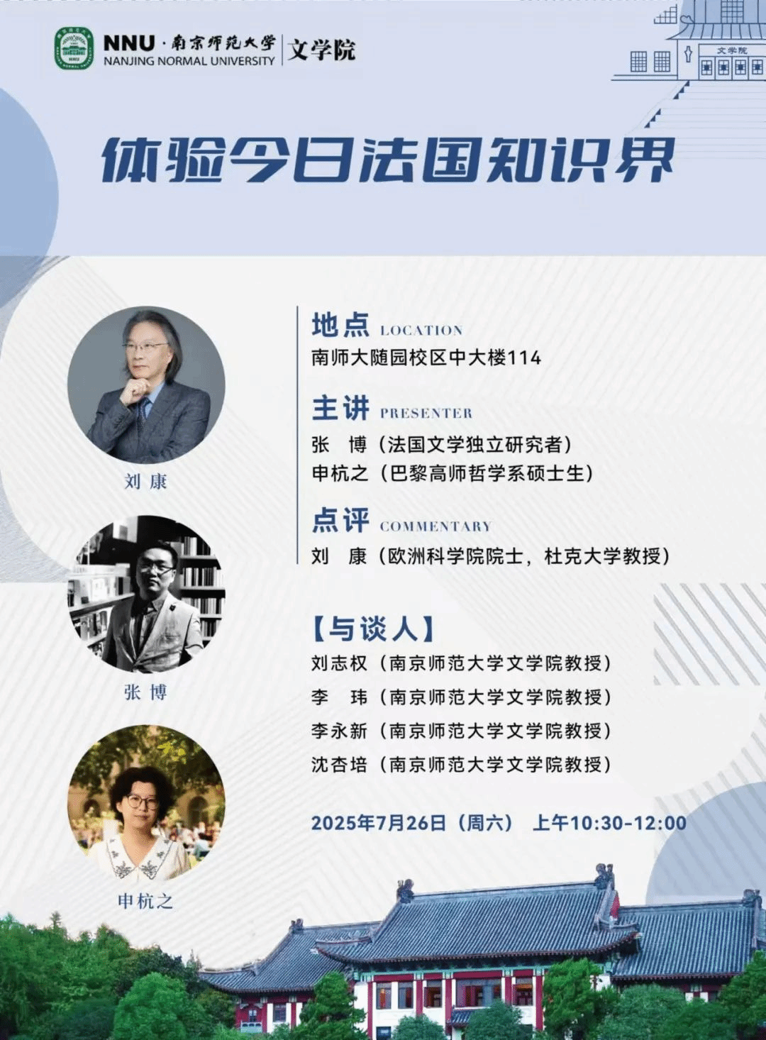副院长沈杏培教授召集和主持,特邀法国文学独立研究者张博、巴黎高师哲学系申杭之担任主讲嘉宾,欧洲科学院院士、杜克大学教授、南京师范大学鸿国讲座教授刘康担任点评嘉宾。知名旅法作家申赋渔,网赌