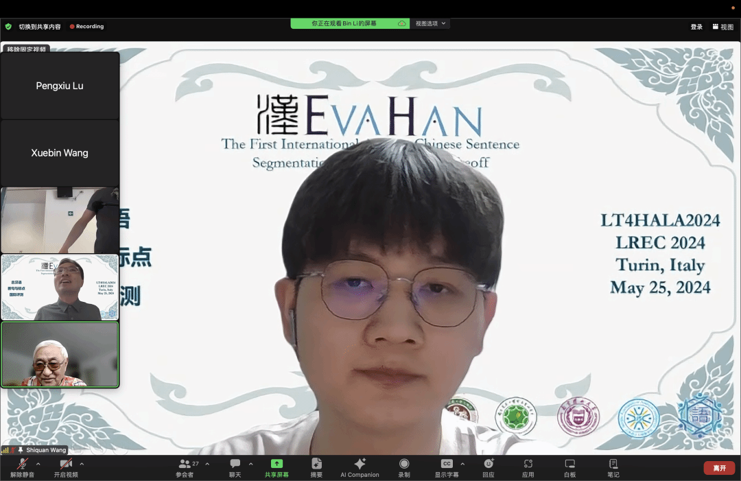 2024年5月25日,由南京师范大学、南京农业大学、南京理工大学联合组织的首届古汉语断句和标点国际评测会议在意大利都灵顺利举行,该会议在国际语言资源与评测大会与计算语言学联合大会LREC-CoLing2024(//lrec-coling-2024.org/)的子会议国际古代语言处理研讨会(LT4HALA)上以线上线下结合的形式举办。