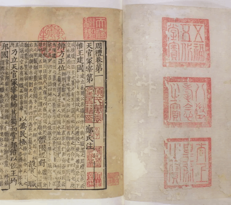 天禄琳琅藏书的外部特征主要有两点:一是书装、签题划一。《天禄琳琅书目·凡例》曰:“签题旧未画一者,今悉更正套签,于旧藏者添识‘乙未重订’,续入者则识‘乾隆乙未重装’,用志裒集次第。”“其宋金版及影宋抄皆函以锦,元版以蓝色绨,明版以褐色绨,用示差等。”二是玺印钤盖划一。《前编》凡例曰:“诸书每册前后皆钤用御玺二:曰‘乾隆御览之宝’,曰‘天禄琳琅’。”《后续》各书有六玺;每册前后副叶上依次钤有“五福五代堂古稀天子宝”、“八征耄念之宝”、“太上皇帝之宝”朱文方印,每册网赌上方钤有“乾隆御览之宝”朱文椭圆印、“天禄继鉴”白文方印,末页上方钤有“天禄琳琅”朱文方印、“乾隆御览之宝”朱文椭圆印。