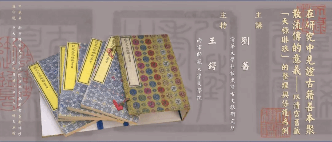 刘老师讲座分“天禄琳琅”特藏的建立、清宫藏书源流、《前编》书的焚燬与重建、天禄琳琅藏书的外部特征、天禄琳琅藏书的流散、天禄琳琅书现存情况、天禄琳琅书的修复与影印出版等七个部分,全面介绍天禄琳琅整理与保护的成绩。