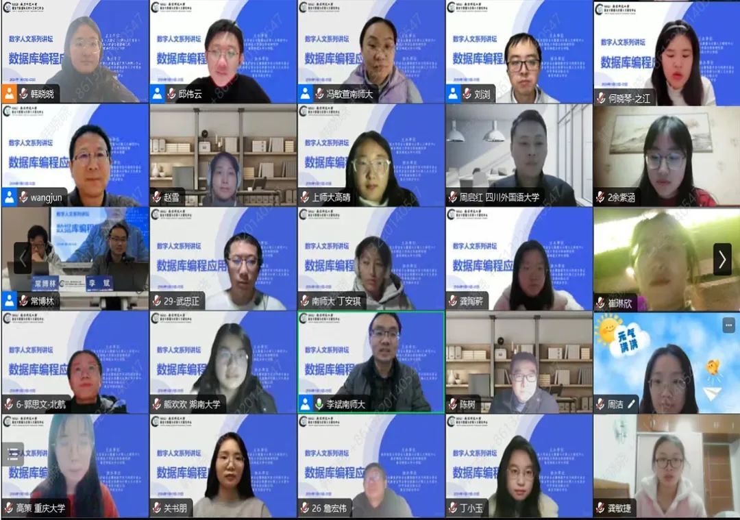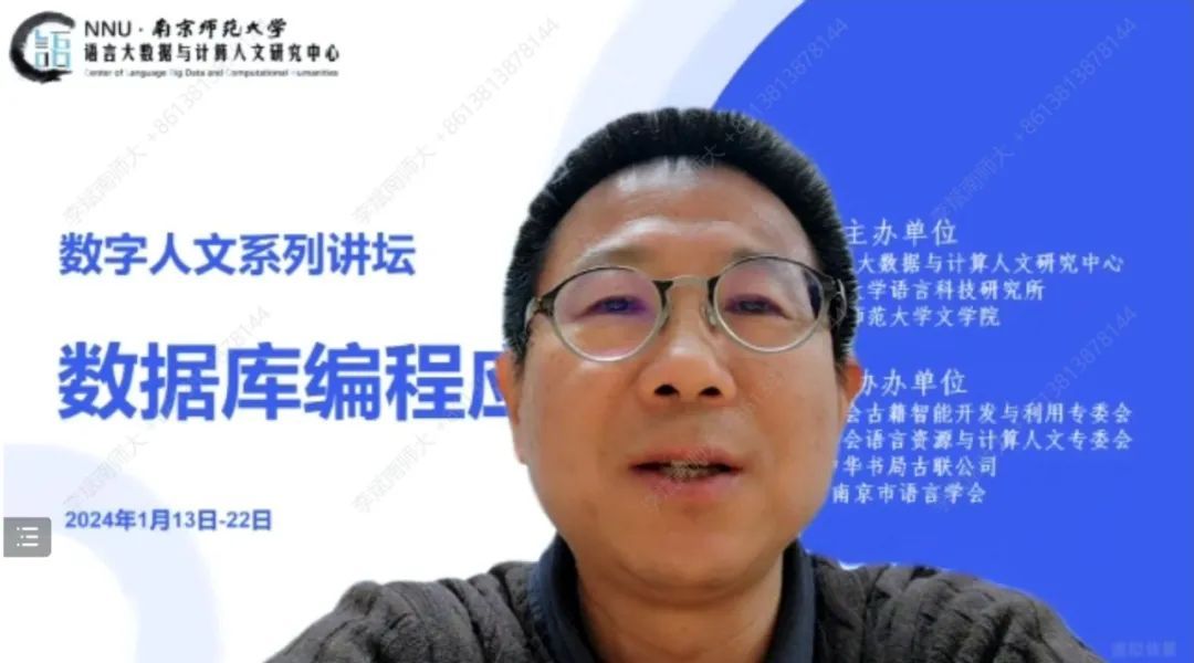 2024年1月22日,南京师范大学语言大数据与计算人文研究中心举办的首届“数字人文系列讲坛·数据库编程应用”顺利结束。来自日本早稻田大学、韩国檀国大学、澳门大学、北京大学、浙江大学、复旦大学等海内外43所高校的近百位师生在经历了九天紧张的课程学习之后,线上开展了课程汇报。特邀北京大学数字人文中心主任王军教授、南京大学历史学院邱伟云副教授、南京农业大学信息管理学院刘浏副教授、网赌-网赌app 冯敏萱副教授出席并点评。