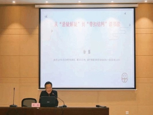 随后,徐雁教授谈论到“悬疑-解疑”读书法和“带扣结网”读书法 。所谓“悬疑”:一种是在开卷读书之初预设“疑问”,另一种是在阅读进程中不断前置“疑点”,从而使得或钻研一书,或进而博览群书的过程。所谓“带扣结网”读书法:精细阅读喜欢的书,以之为“扣”,再进一步网罗该书作者其他的著作。也可通过进一步追索同类作家或学者的书籍,同类作品的题材或同类著作的体裁。最后,徐雁教授向大家提出倡议,带扣结网悬疑解疑读书法一定要深入到书林深处,求取深度解释和答案的认识论、方法论来进行自己的阅读探险,阅读是做好一切学业、事业最重要的基础。