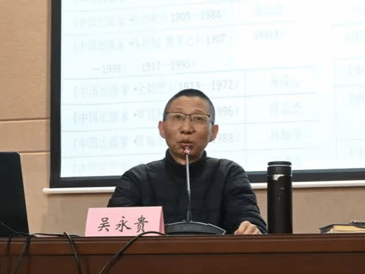 讲座伊始,万宇副教授介绍了吴永贵教授和徐雁教授的学术成就。吴永贵教授是武汉大学的博士生导师,主要著作有《中国出版史》《民国出版史》《民国图书出版史编年》《中国期刊史(第二卷)》等。徐雁教授是南京大学的博士生导师,兼中国图书馆学会阅读推广委员会副主任等,代表作有《秋禾书话》《藏书与读书》《中国旧书业百年》《阅读的人文与人文的阅读》等,先后荣获我国“全民阅读十佳推广人”(2018)及“全国二十佳藏书人”(2023)等荣誉称号。
