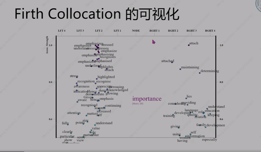 那么搭配研究怎么去创新呢?唐教授提出首先要知道现有的研究中有什么不足,并指出关于搭配研究在当下的不足首先表现在表征形式上,“表格形式”不便于人工理解、分析,并且缺乏全局性,导致做句法、语义信息解读不方便。“搭配网络”采用可视化方法,但是与语言的线性形式不一致,且缺乏全局性,难以解读句法模式。基于上述不足,创新性地提出一种新的、以“搭配序列”为主体的形式化表征。这样的表征方式在可视化过程中准确地传递出了语言的线性特征,可以得出节点词与搭配词结合使用的不同句法形态,实现与弗思定义更为契合的、对不同情景语境图式的分析。