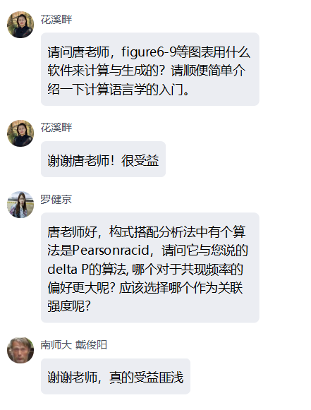 在提问环节,唐教授分享了自己怎样从英语专业进入到计算语言学领域的经验。在唐教授的解答中学员表示“受益匪浅”。
