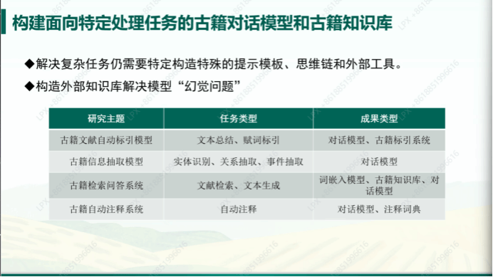 王东波教授进一步明确了未来的研究计划。首先,是提供更多参数更大的基座模型。他展示了目前已经设计完成的模型及其训练状态,并指出进行该研究的初衷是希望做好、做大、做强古籍智能化,因此希望大家能够真正使用模型,在使用中反馈问题,以便改进。他同样说明了在生成回答的过程中会出现的一些问题,而解决方案则是构建面向特定处理任务的古籍对话模型和古籍知识库。通过构造特殊的提示模板、思维链和外部工具,从而解决更为复杂的任务;通过构造外部知识库,从而解决模型的“幻觉问题”等等。王教授以不同的研究任务为例,具体说明了在未来能够进一步深化的研究方向。