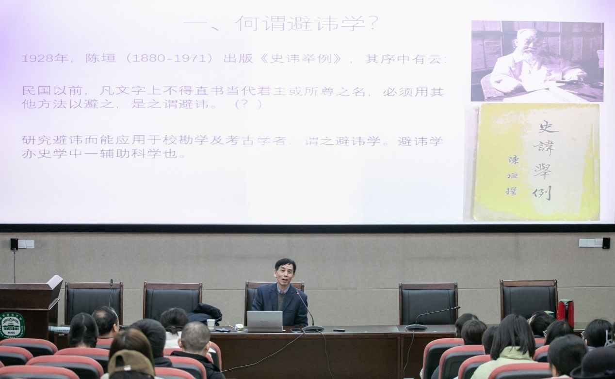 程老师首先破题,从“何谓避讳学”讲起,引及陈垣《史讳举例》的定义,并说《史讳举例》一书有方法论上的自觉。不讲避讳学,不足以读中国之史,避讳学是史学中重要的一个辅助学科。前辈著名学者劳榦“四支柱”说(官制、历法、避讳、音韵)及邓广铭“三个要素”(时间、地点、人物)“四把钥匙”(年代、地理、官制、目录)说,都和避讳有一定的关系。对其他避讳著作如周广业《经史避名汇考》、王彦坤《历代避讳字汇典》等,程老师也极力赞许其搜罗资料之功。