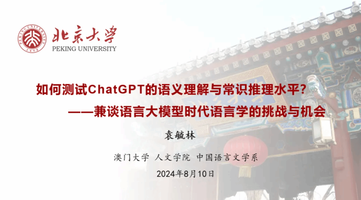 开幕式后,澳门大学中文系系主任袁毓林讲授了主题为“如何测试ChatGPT的语义理解与常识推理水平”的讲座。