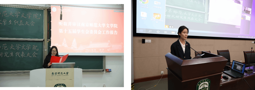 随后会议进入正式议程。第一项议程,首先由刘雅坤代表第十五届学生会委员会做工作报告。刘雅坤以“坚守初心使命,担当服务本色,争立时代潮头”为主题发言,对于学生会的工作进行了回顾总结,从坚持思想引领、深化组织建设、聚焦学生成长三个方面报告了学生会的工作成果,提出“加强理论学习、巩固工作基础、坚持深化改革、庚续历史文脉”的工作展望。接着,由白菊荣代表第三届研究生会委员会做工作报告。白菊荣以“青年挺膺铸华章,惟实励新再启航”为题,在思想、组织、学风、文化和服务五个方面对研究生会的工作进行了回顾总结,对思想引领、深化改革、科研创新、服务质量等方面进行工作展望。全体与会代表经过认真审议,和研究生会的工作报告。