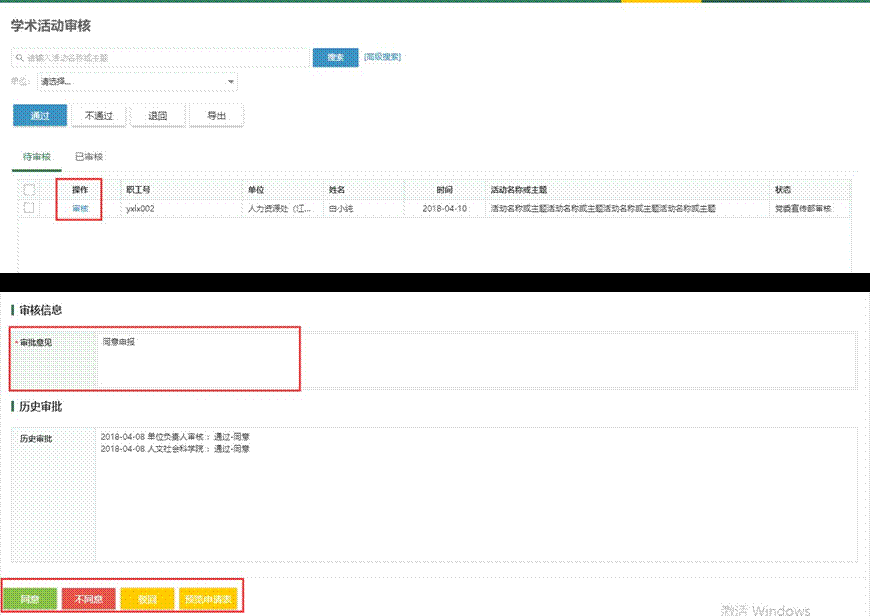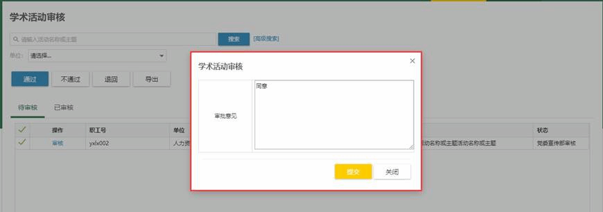 2.2.2点击“通过”按钮,弹出审核意见框,默认显示“同意”(可重新编辑内容),点“提交”则该学术活动申请审核通过: