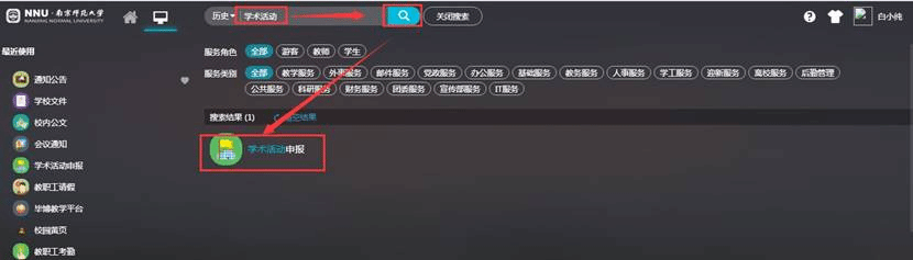方式二:或在办事大厅网赌顶部的搜索框中输入“学术活动”,点击搜索找到“学术活动申报”应用(支持模糊检索),点击应用图标即可进入该应用。