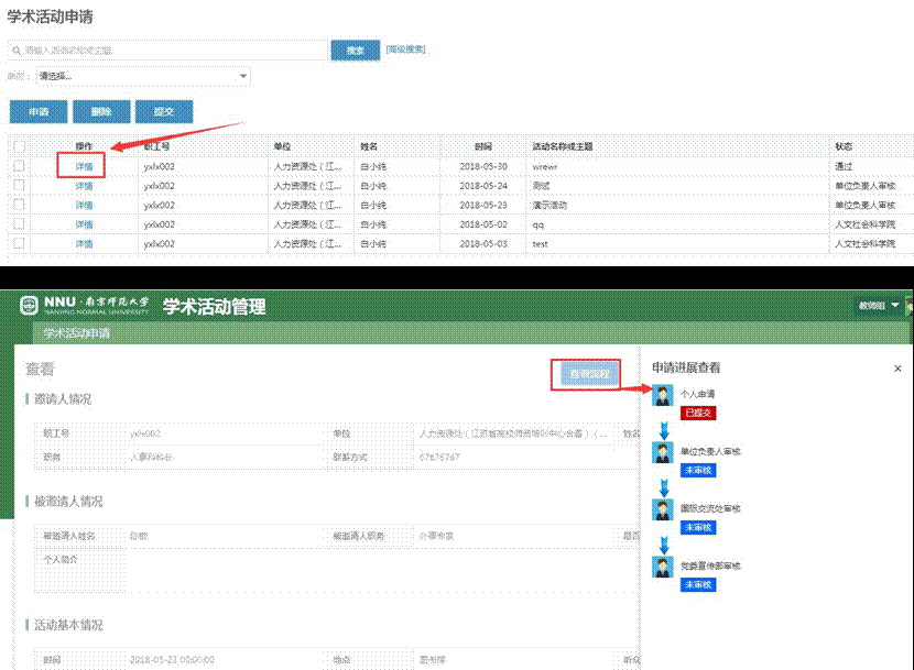 2.1.4点击已申报学术活动申请记录的“详请”功能按钮,进入以下界面,点击“查看流程”可查看该申请需要历经的流程。
