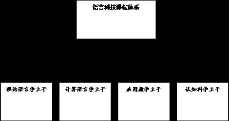 (五)课程内容:围绕语言科技复合型人才的培养目标,突出文理工渗透和语言研究技术化,建构了包括理论语言学、计算语言学、应用数学、认知科学四大主干课程的新型课程体系。图示如下: