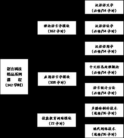 三个课群合计342学时。其中,理论语言学课群162学时;应用语言学课群108学时;技能教育训练课群72学时。各个课群对应的课程内容及其学时如下: