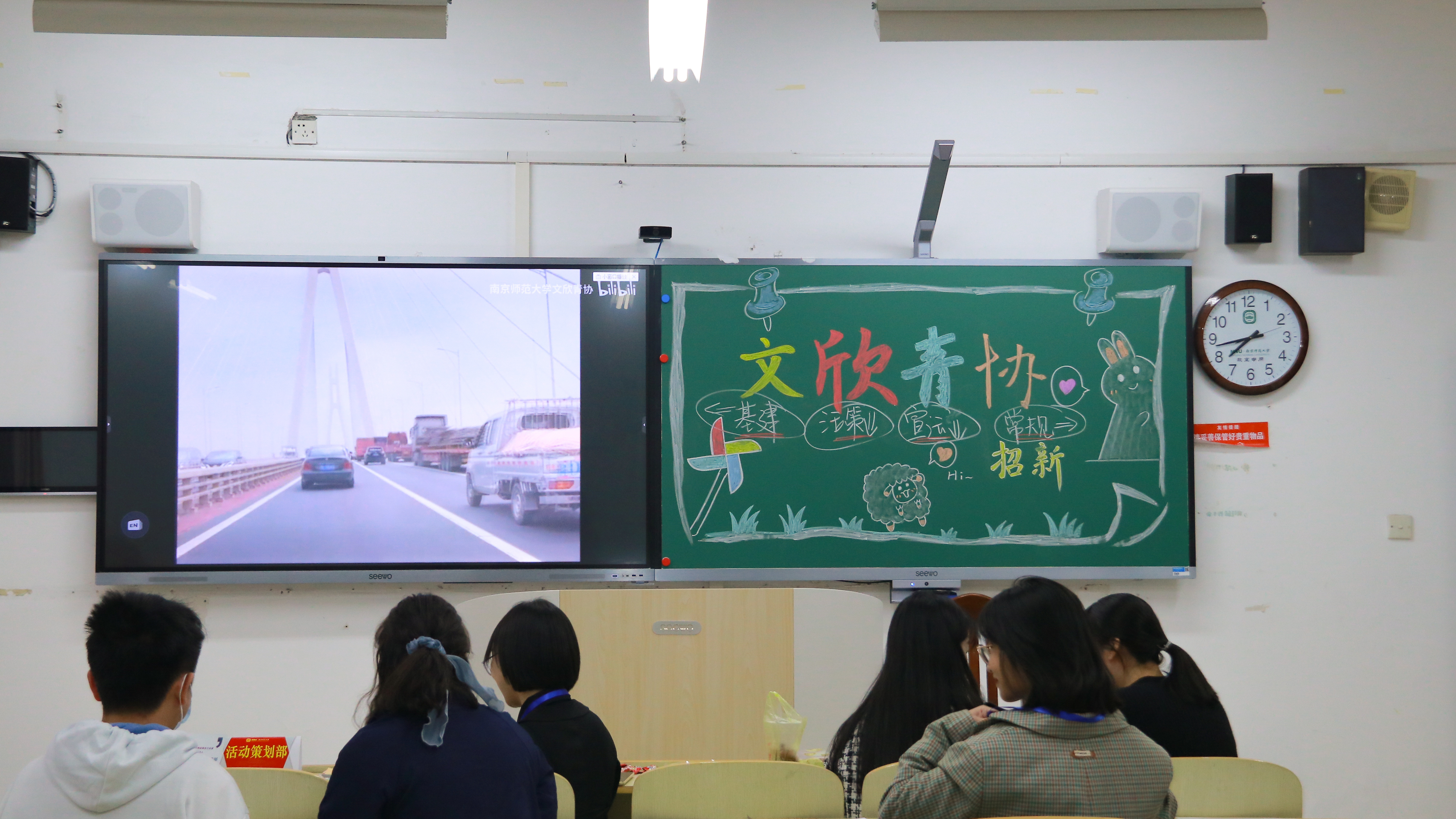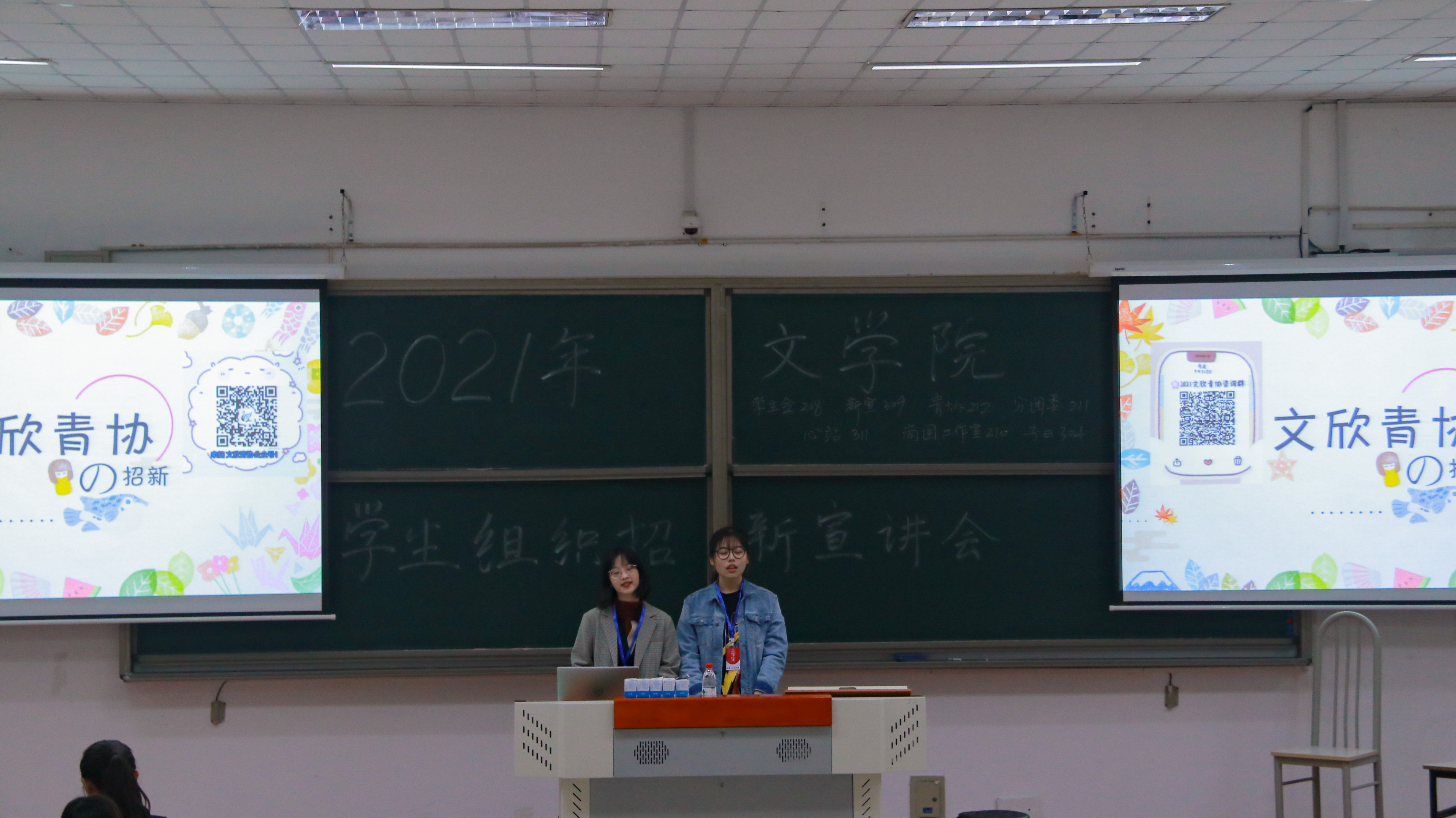 在学正楼402教室,文欣青协面向大一新生们开展了宣讲。贺璟禧和王秋琪两位部长担任了此次招新宣讲的主讲人。首先,两位部长对文欣青协作了总体介绍。其后,主讲人们对青协的四大部门,即常规事务部、宣传运营部、活动策划部、基地建设部分别展开作了具体的说明,介绍了每个部门的分工情况,让新生们有了初步的了解。接着,主讲人们进行了文欣青协优秀成果展示,向新生们介绍了历年来青协获得过的各项荣誉。最后,是文欣青协现有志愿基地的情况介绍。此外,文欣青协所有部长们还准备了一个精彩的招新宣传视频,展现了文欣青协成员们的工作日常,也传达了今年各位部长给新生的寄语。同时,主席和部长们为座位上的新生们分发了招新传单、报名表及文欣青协为大家精心准备的小礼物。