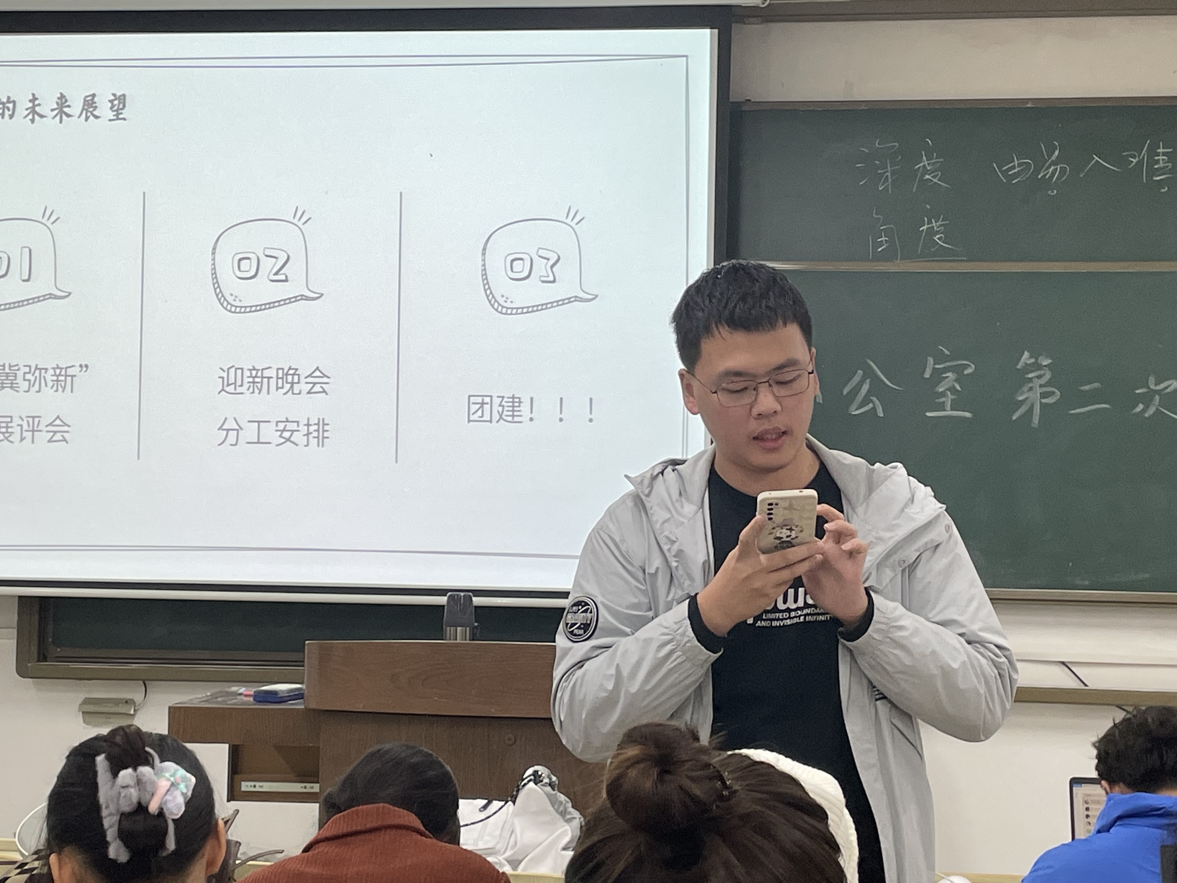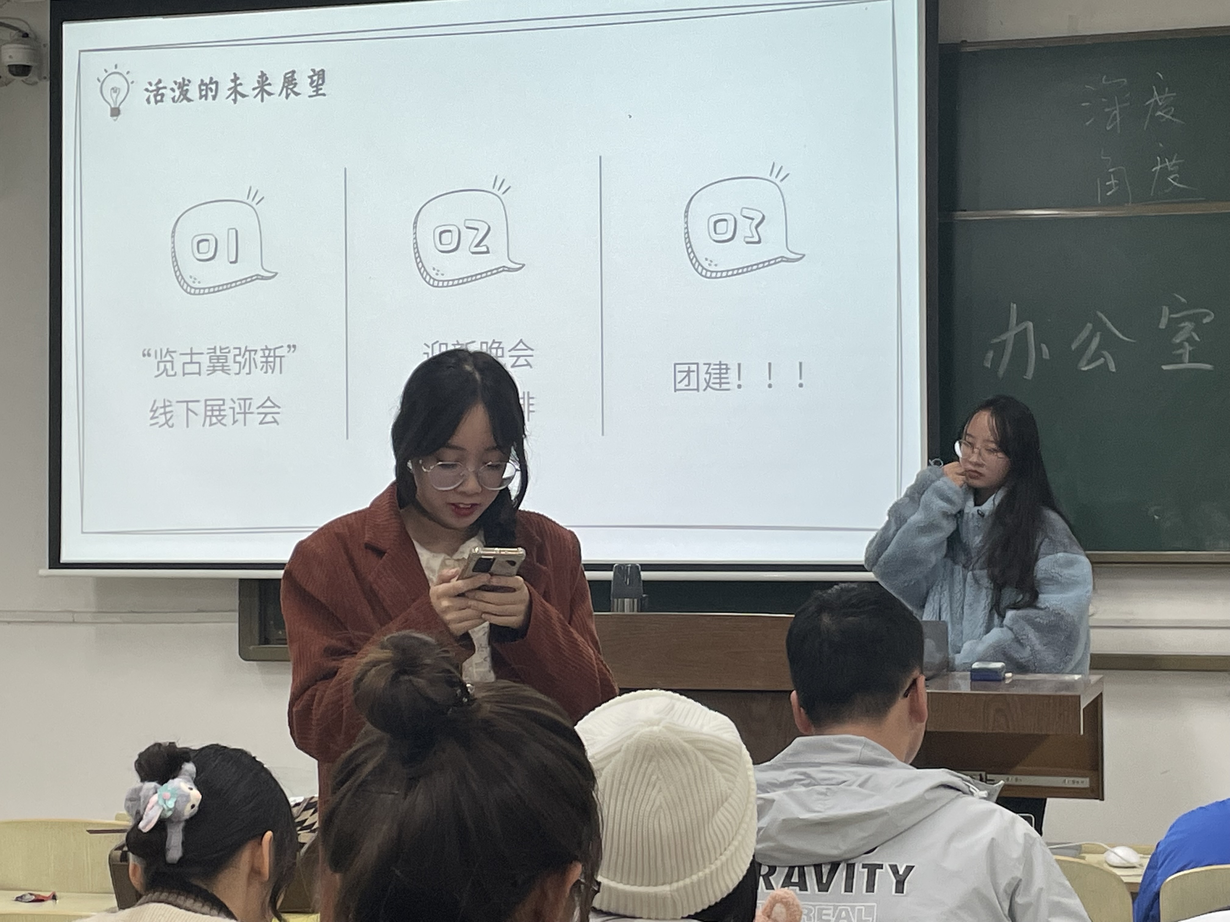 然后,刘艺涵主任介绍了“览古冀弥新”系列活动线下展评会规划并鼓励干事们提出建议,迎新晚会各工作组分管主任详细布置工作组的任务。未来的工作规划为办公室工作有条不紊地开展提供了方向和指南。
