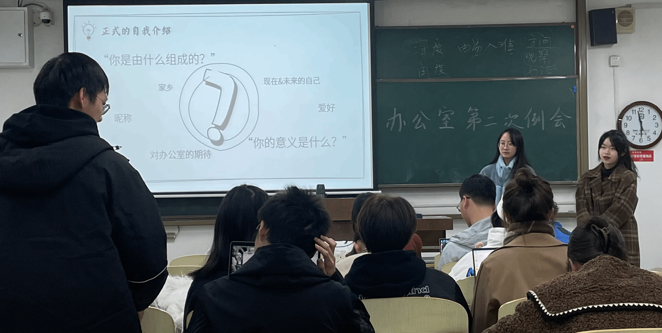首先,办公室的各主任及干事轮流进行了正式的自我介绍。干事们讲述了一个月以来办公室工作的收获与成长并表达了未来与办公室一同成长的愿景。主任与干事们在介绍中加深了对彼此的了解,为日后办公室工作中的合作分工打下基础。